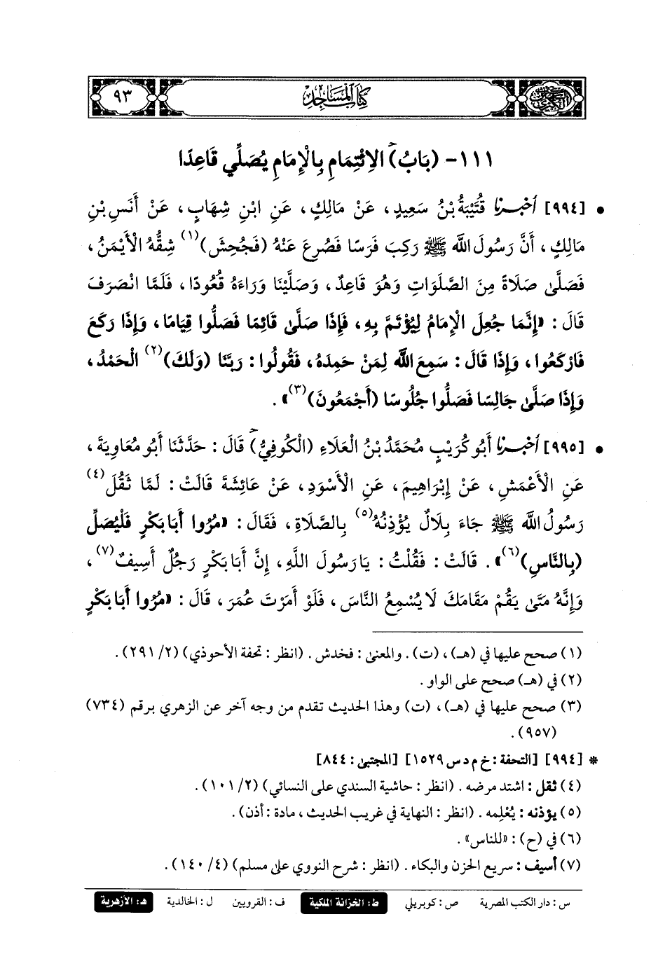 995- أَخبَرنا أَبو كُرَيْبٍ مُحَمدُ بنُ العَلاءِ الكوفي، قَالَ: حَدثنا أَبو مُعاويَةَ، عَنِ الأَعْمَشِ، عَن إِبرَاهِيمَ، عَنِ الأَسْوَدِ، عَن عَائِشَةَ قَالَتْ: لَمَّا ثَقُلَ رَسُولُ اللهِ صَلى الله عَليه وسَلم جَاءَ بِلالٌ يُؤْذِنُهُ بِالصَّلاةِ، فَقَالَ: مُرُوا أَبَا بَكْرٍ فَلْيُصَلِّ بِالنَّاسِ، قَالَتْ: فَقُلْتُ: يَا رَسُولَ اللهِ، إِنَّ أَبَا بَكْرٍ رَجُلٌ أَسِيفٌ، وَإِنَّهُ مَتَى يَقُمْ مَقَامَكَ لا يُسْمِعِ النَّاسَ، فَلَوْ أَمَرْتَ عُمَرَ، قَالَ: مُرُوا أَبَا بَكْرٍ فَلْيُصَلِّ بِالنَّاسِ. فَقُلْتُ لِحَفْصَةَ: قَوْلِي لَهُ، فَقَالَتْ لَهُ، فَقَالَ: إِنَّكُنَّ لأَنْتُنَّ صَوَاحِبَاتُ يُوسُفَ، مُرُوا أَبَا بَكْرٍ فَلْيُصَلِّ بِالنَّاسِ، قَالَتْ: فَأَمَرُوا أَبَا بَكْرٍ، فَلَمَّا دَخَلَ فِي الصَّلاةِ وَجَدَ رَسُولُ اللهِ صَلى الله عَليه وسَلم مِنْ نَفْسِهِ خِفَّةً، قَالَتْ: فَقَامَ يُهَادَى بَيْنَ رَجُلَيْنِ، وَرِجْلاهُ تَخُطَّانِ فِي الأَرْضِ، قَالَتْ: فَلَمَّا دَخَلَ المَسْجِدَ، سَمِعَ أَبو بَكْرٍ حِسَّهُ فَذَهَبَ لِيَتَأَخَّرَ، فَأَوْمَأَ إِلَيْهِ رَسُولُ اللهِ صَلى الله عَليه وسَلم أَنْ قُمْ كَمَا أَنْتَ، قَالَتْ: فَجَاءَ رَسُولُ اللهِ صَلى الله عَليه وسَلم حَتَّى قَامَ عَن يَسَارِ أَبي بَكْرٍ جَالِسًا، فَكَانَ رَسُولُ اللهِ صَلى الله عَليه وسَلم يُصَلِّي بِالنَّاسِ جَالِسًا وَأَبو بَكْرٍ قَائِمًا، يَقْتَدِي أَبو بَكْرٍ بِرَسُولِ اللهِ صَلى الله عَليه وسَلم، وَالنَّاسُ يَقْتَدُونَ بِصَلاةِ أَبي بَكْرٍ.