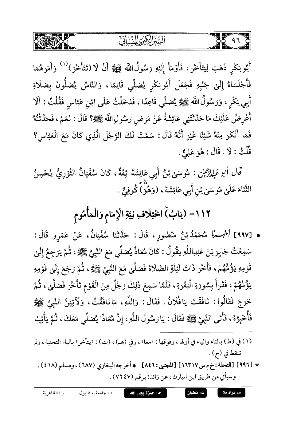 997- أَخبَرنا مُحَمدُ بنُ مَنصُورٍ، قَالَ: حَدثنا سُفيانُ، عَن عَمْرٍو، قَالَ: سَمِعْتُ جَابِرَ بْنَ عَبدِ اللهِ يَقُولُ: كَانَ مُعَاذٌ يُصَلِّي مَعَ النَّبيِّ صَلى الله عَليه وسَلم، ثُمَّ يَرْجِعُ إِلَى قَوْمِهِ يَؤُمُّهُمْ، فَأَخَّرَ ذَاتَ لَيْلَةٍ الصَّلاةَ، فَصَلَّى مَعَ النَّبيِّ صَلى الله عَليه وسَلم، ثُمَّ رَجَعَ إِلَى قَوْمِهِ يَؤُمُّهُمْ، فَقَرَأَ بِسُورَةِ البَقَرَةِ، فَلَمَّا سَمِعَ ذَلِكَ رَجُلٌ مِنَ القَوْمِ تَأَخَّرَ فَصَلَّى، ثُمَّ خَرَجَ، فَقَالُوا: نَافَقْتَ يَا فُلانُ، فَقَالَ: وَاللهِ مَا نَافَقْتُ، وَلآتِيَنَّ النَّبيَّ صَلى الله عَليه وسَلم فَأُخْبِرَهُ، فَأَتَى النَّبيَّ صَلى الله عَليه وسَلم، فَقَالَ: يَا رَسُولَ اللهِ، إِنَّ مُعَاذًا يُصَلِّي مَعَكَ، ثُمَّ يَأْتِينَا فَيَؤُمُّنَا، وَإِنَّكَ أَخَّرْتَ الصَّلاةَ البَارِحَةَ، فَصَلَّى مَعَكَ، ثُمَّ رَجَعَ فَأَمَّنَا فَاسْتَفْتَحَ سُورَةَ البَقَرَةِ، فَلَمَّا سَمِعْتُ ذَلِكَ تَأَخَّرْتُ فَصَلَّيْتُ، وَإِنَّمَا نَحْنُ أَصْحَابُ نَوَاضِحَ نَعْمَلُ بِأَيْدِينَا، فَقَالَ لَهُ النَّبيُّ صَلى الله عَليه وسَلم: يَا مُعَاذُ أَفَتَّانٌ أَنْتَ، اقْرَأْ سُورَةَ كَذَا، وَسُورَةَ كَذَا.