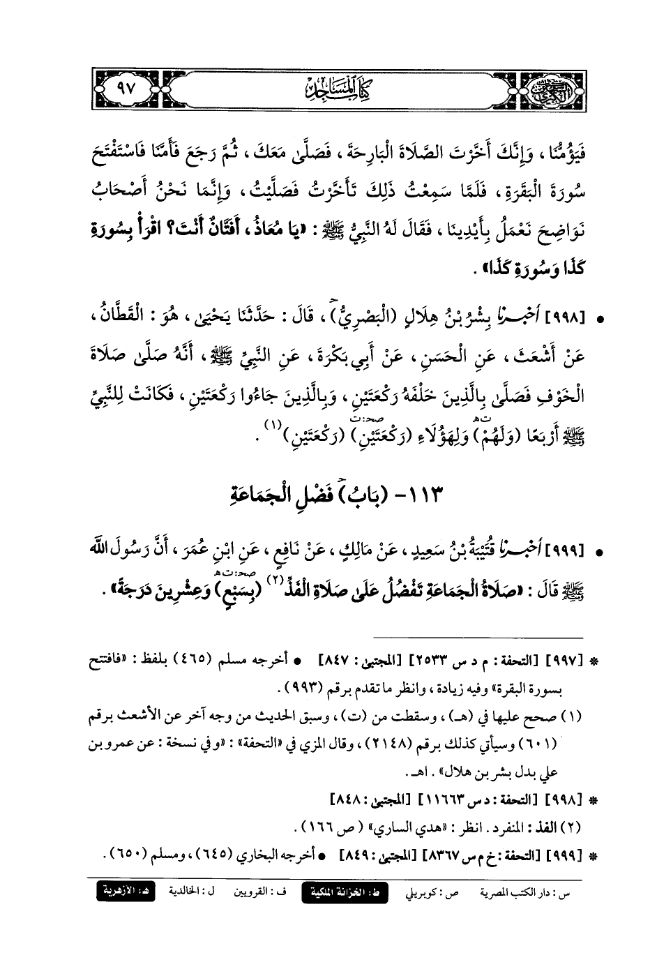 999- أَخبَرنا قُتَيبَةُ بنُ سَعِيدٍ، عَن مَالِكٍ، عَن نَافِعٍ، عَنِ ابنِ عُمَرَ، أَنَّ رَسُولَ اللهِ صَلى الله عَليه وسَلم قَالَ: صَلاةُ الجَمَاعَةِ تَفْضُلُ عَلَى صَلاةِ الفَذِّ بِسَبْعٍ وَعِشْرِينَ دَرَجَةً.