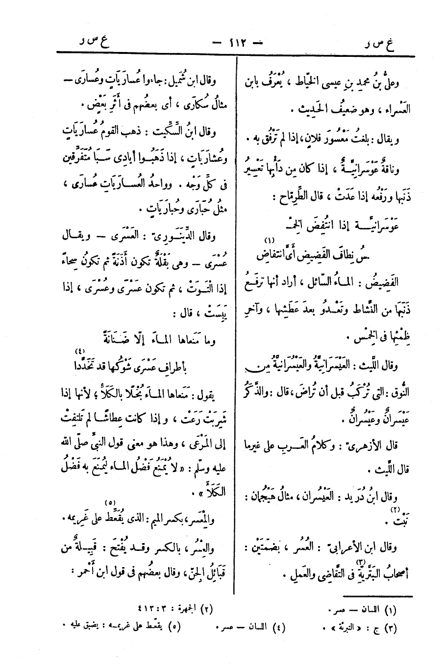 وقال ابن شُمَيل: جاءوا عُسارَيَاتٍ وعُسارَى - مثالُ سُكارَى، أي بعضُهم في أَثَرِ بَعْضٍ.