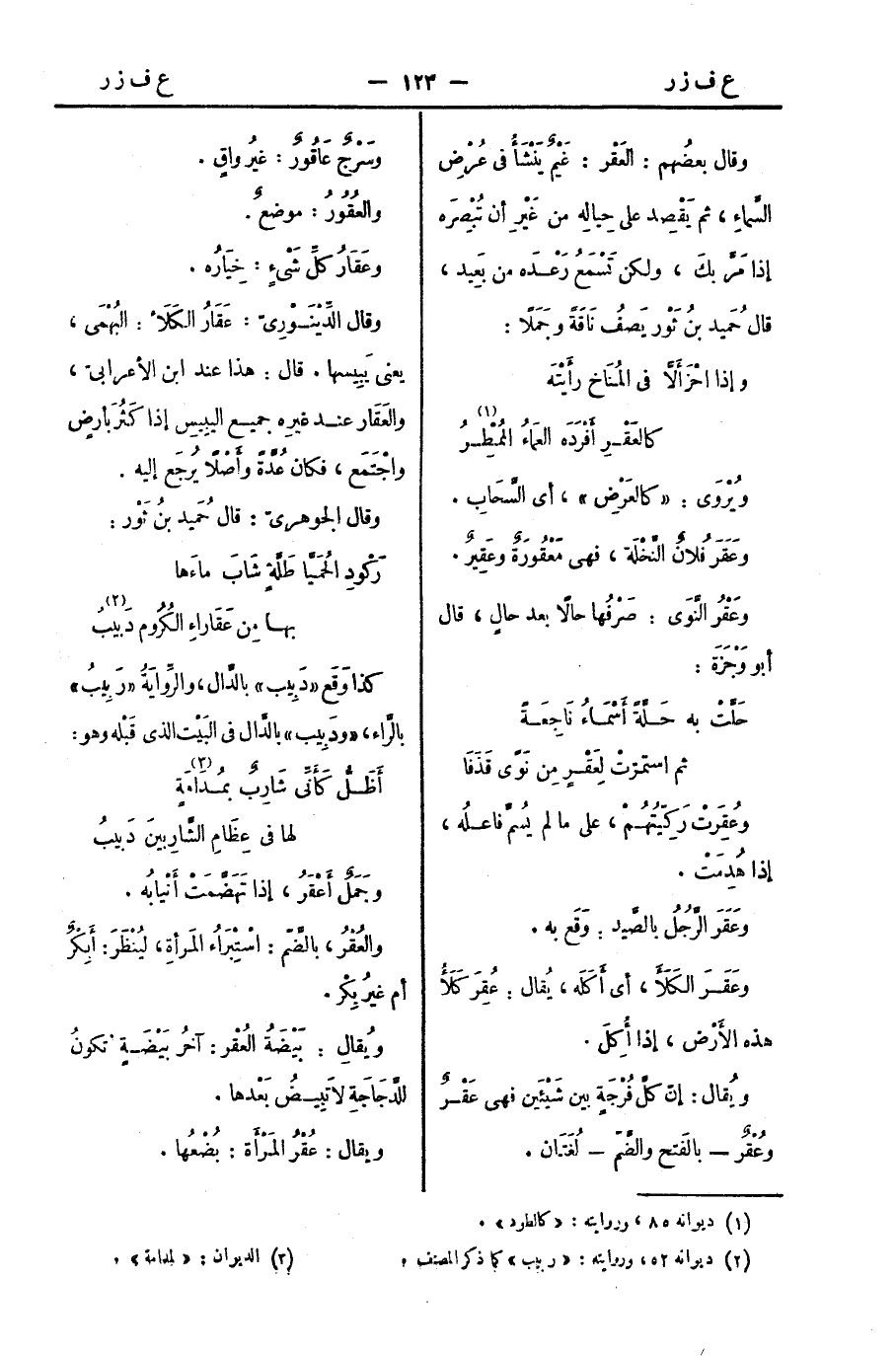 ويُقال: إنّ كلَّ فُرْجَةٍ بين شَيْئَين فهي عَقْرٌ وعُقْرٌ - بالفَتح والضَّمّ - لُغَتَان.