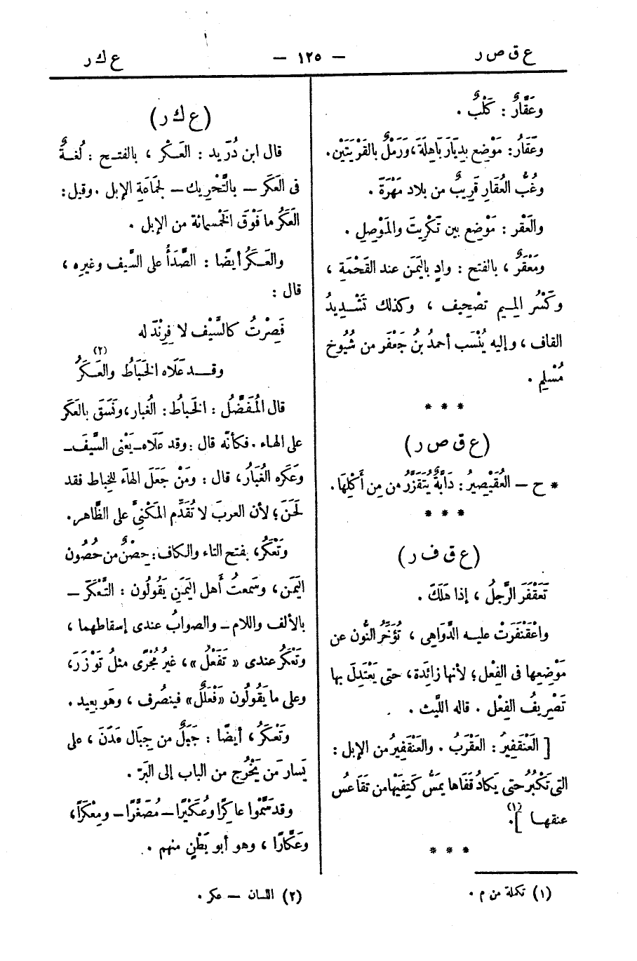 قال ابن دُرَيد: العَكْر، بالفتح: لُغةٌ في العَكَر - بالتَّحْرِيك - لجَمَاعةِ الإبل. وقيل: العَكَرُ ما فَوْقَ الخَمْسمائة من الإبل.