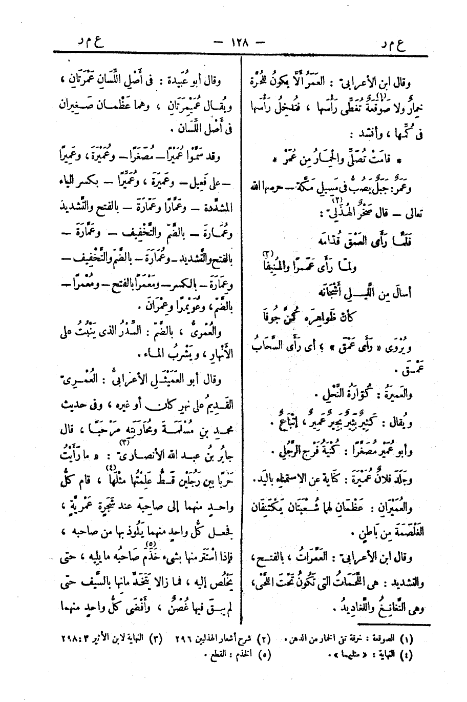 وقال أبو العَمَيْثَلِ الأعرابيُّ: العُمْرِيّ القَدِيمُ على نهرٍ كان أو غيره، وفي حديث محمدِ بنِ مُسْلَمَةَ ومُحَارَبَتِهِ مَرْحَبًا، قال جابرُ بنُ عبد الله الأنصاريّ: " ما رَأَيْتُ حَرْبًا بين رَجُلَيْن قَطُّ عَلِمْتُها مثْلَها، قام كلُّ واحدٍ منهما إلى صاحِبِه عند شَجَرةٍ عَمْريَّةٍ، فجعل كلُّ واحدٍ مهما يَلُوذ بها من صاحبه، فإذا اسْتَتَر منها بشيء خَذَمَ صَاحبُه ما يلِيه، حتى يَخْلُص إليه، فما زالا يَتَخَذَّمانِها بالسَّيف حتى لم يبقَ فيها غُصْنٌ، وأَفْضَى كلُّ واحدٍ منهما