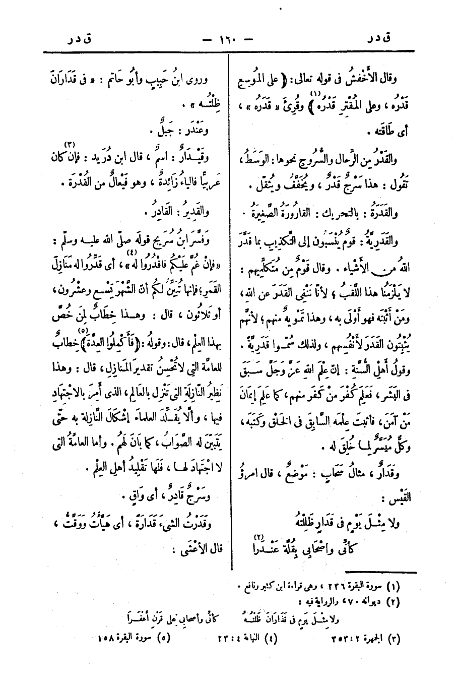 والقَدَرِيَّةُ: قومٌ يُنْسَبُون إلى التَّكذِيبِ بما قَدَّرَ اللهُ من الأَشْياء. وقال قَوْمٌ مِن مُتَكلِّمِيهم: لا يَلْزَمُنا هذا اللَّقَبُ؛ لأنّا نَنْفِي القَدَرَ عن اللهِ، ومَنْ أَثْبَته فهو أَوْلَى به، وهذا تَمْويهٌ منهم؛ لأنَّهم يُثْبِتُون القَدَرَ لأَنْفُسِهم، ولذلك سُمّوا قَدَرِيَّةً. وقولُ أَهْلِ السُّنَّةِ: إنّ عِلْمَ اللهِ عَزَّ وجَلَّ سَبَقَ في البَشَر، فعَلِمَ كُفْرَ منْ كَفَر منهم، كما عَلِمَ إيمَانَ مَنْ آمَنَ، فأثبتَ عِلْمَه السَّابِقَ في الخَلْق وكَتَبَه، وكلٌّ مُيَسَّرٌ لِما خُلِقَ له.