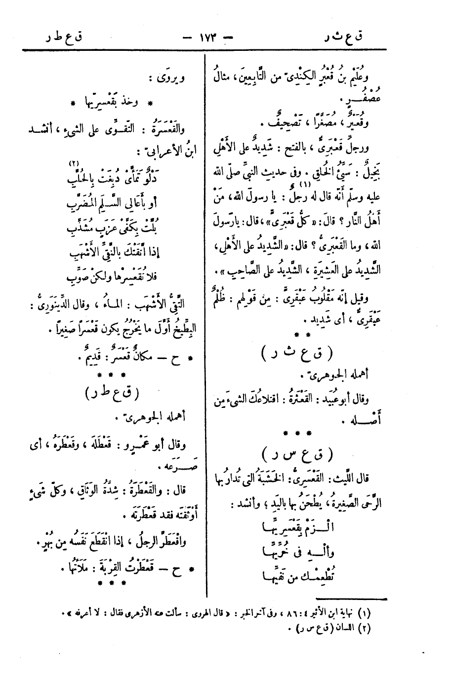 قال اللَّيث: القَعْسَرِيُّ: الخَشَبَةُ التي تُدارُ بها الرَّحَى الصَّغِيرةُ، يُطْحَنُ بها باليَدِ؛ وأنشد: