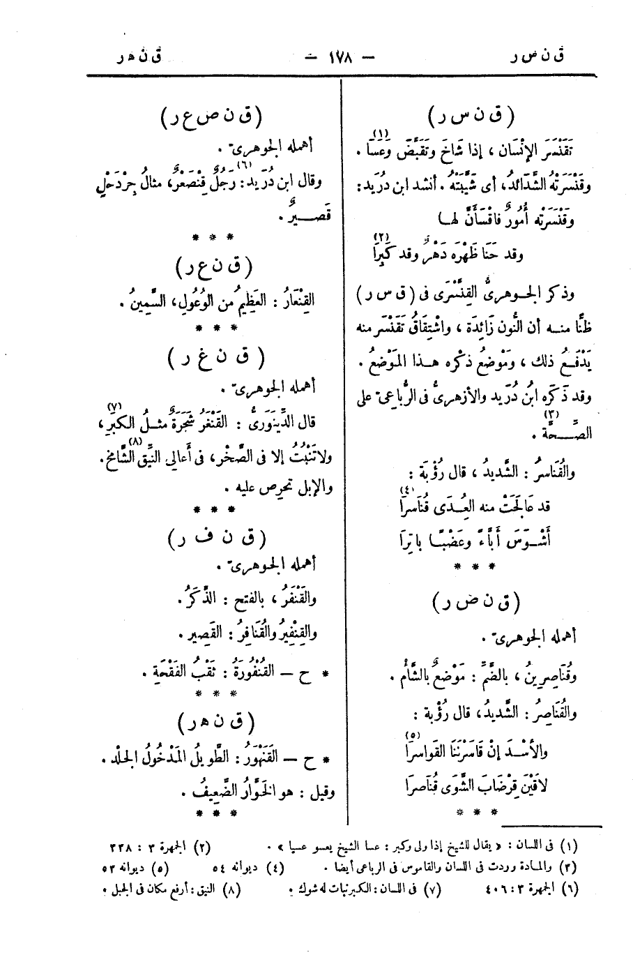 وذكر الجوهريُّ القِنَّسْرَى في (ق س ر) ظنًّا منه أن النُّون زَائِدَة، واشْتِقَاقُ تَفَنْسَر منه يَدْفَعُ ذلك، ومَوْضعُ ذكْره هذا المَوْضعُ. وقد ذَكَره ابنُ دُرَيد والأزهريُّ في الرُّباعِيّ على الصِّحَّة.