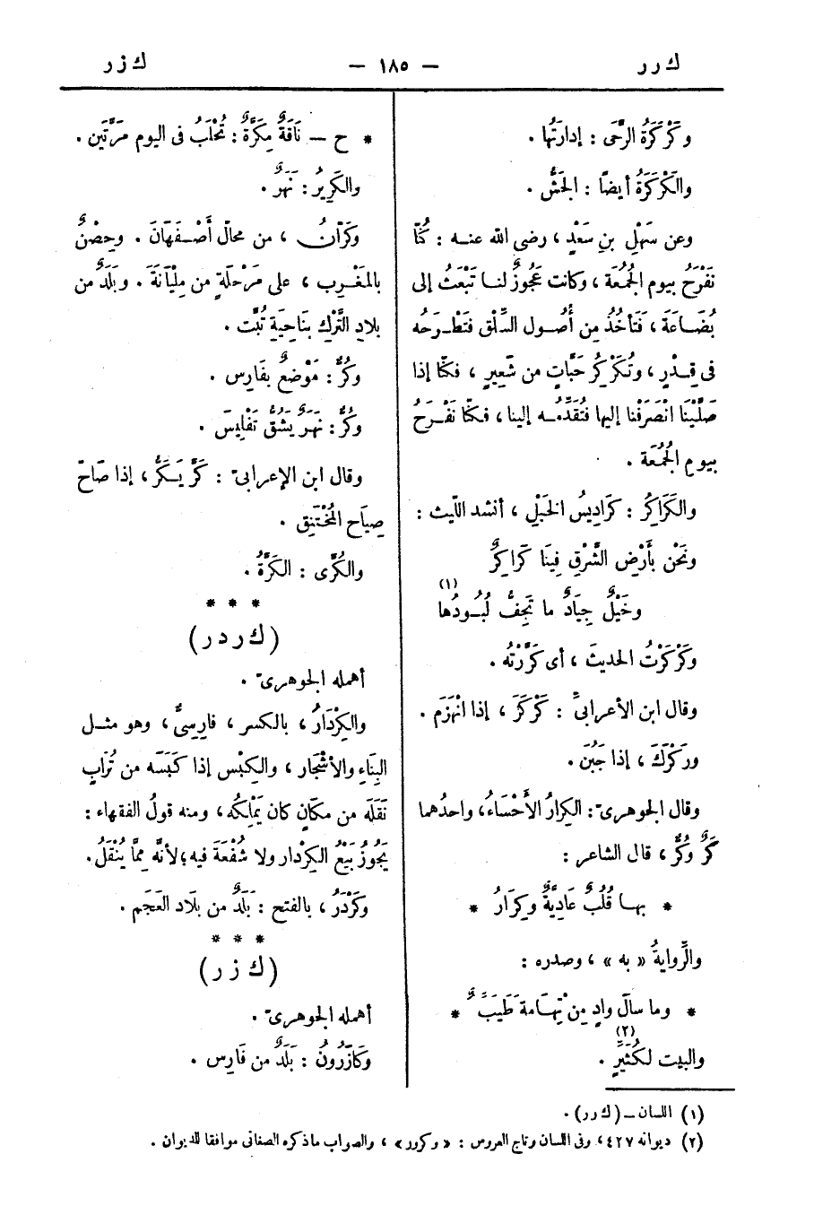 وقال الجوهريّ: الكِرارُ الأَحْسَاءُ، واحدُهما كَرٌّ وكُرٌّ، قال الشاعر: