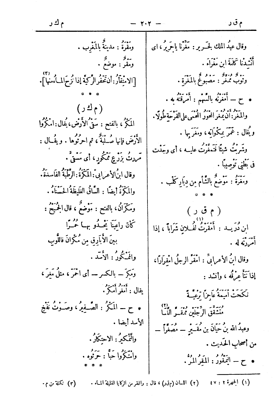* ح - المَكْرُ: الصَّفِيرُ، وصَوْتُ نَفْخِ الأسد أيضا.