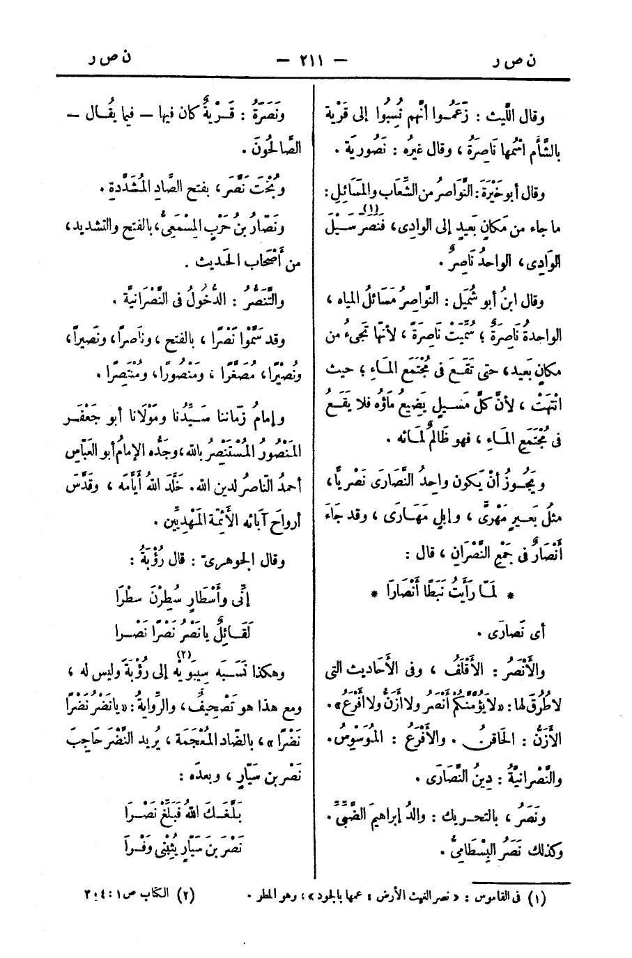 وقال ابنُ شُمَيل: النَّواصِرُ مَسَائلُ المياه، الواحدةُ نَاصِرَةٌ؛ سُمِّيَتْ نَاصِرَةً، لأنّها تَجيءُ من مكانٍ بَعيد، حتى تَقَعَ في مُجْتَمَع المَاءِ؛ حيث انْتهَتْ، لأنَّ كلَّ مَسيلٍ يَضِيعُ مَاؤُه فلا يَقَعُ في مُجْتَمَعِ المَاءِ، فهو ظَالمٌ لمَائه.