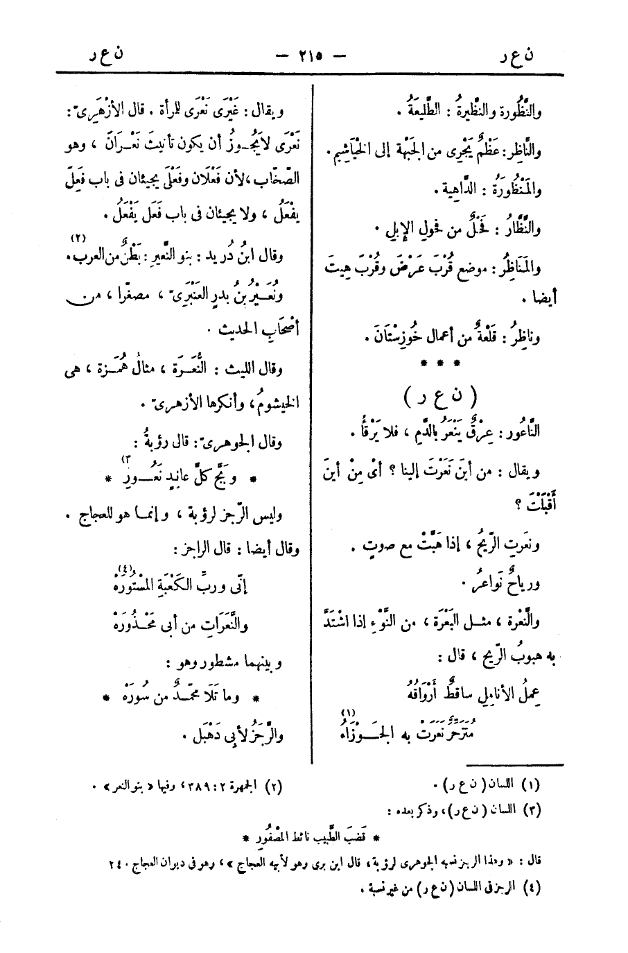 وقال الليث: النُّعَرَة، مثالُ هُمَزة، هي الخيشومُ، وأنكرها الأزهريّ.
