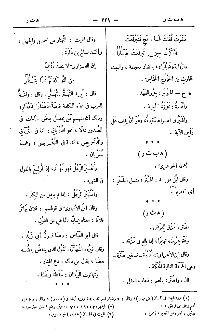 قال أبو العَبّاس: وهذا قولُ أبي زَيْدٍ. وقال غيرُه: المُهَاتَرَة: القَوْل الذي ينقضُ بعضُه بعضًا، يقال من ذلك: دع الهِتار.