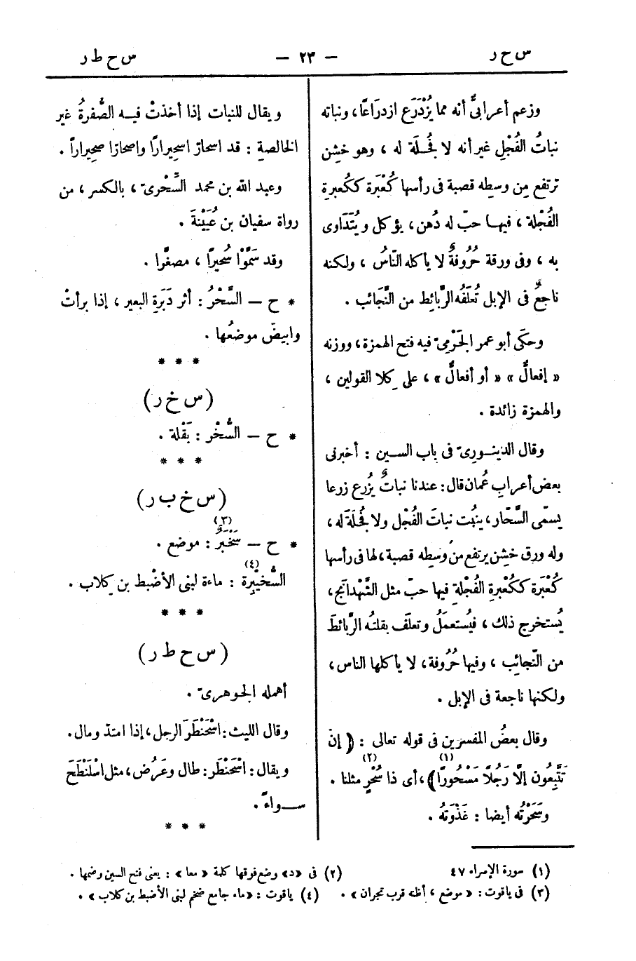 وقال الدينورِيّ في باب السين: أخبرني بعض أعرابِ عُمان قال: عندنا نباتٌ يُزرع زرعا يسمّى السَّحّار، ينبُت نباتَ الفُجْل ولا فُجْلَةَ له، وله ورق خشِن يرتفع من وسطِه قصبة، لها في رأسها كُعْبَرة ككُعْبرةِ الفُجْلةِ فيها حبّ مثل الشَّهْدانَج، يُستخرج ذلك، فيُستعمَلُ وتعلَف بقلتُه الرَّبائطَ من النّجائِب، وفيها حُرُوفة، لا يأكلها الناس، ولكنها ناجعة في الإبل.