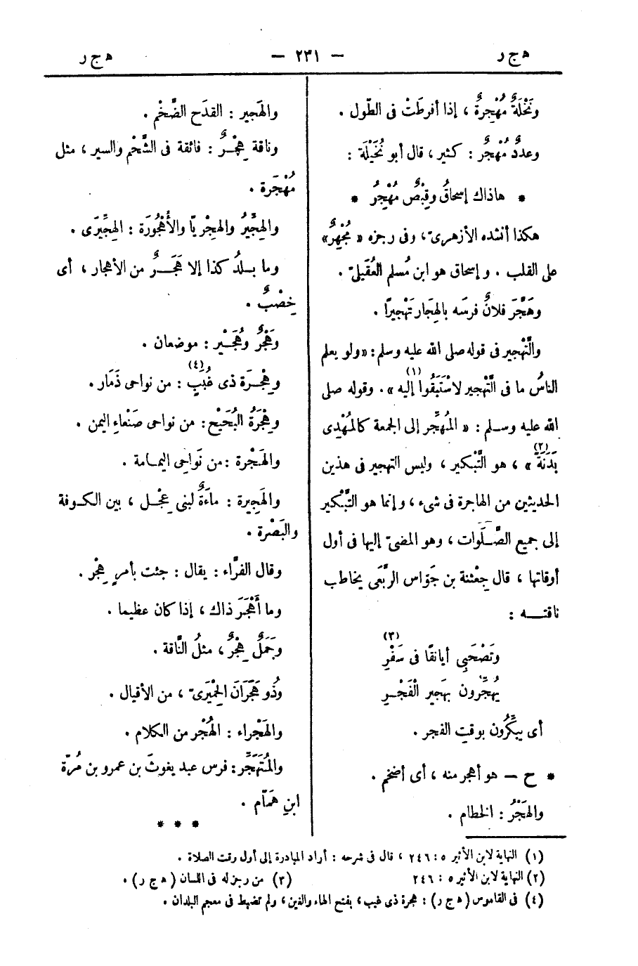 والتَّهجير في قولِه صلى الله عليه وسلم: " ولو يعلم الناسُ ما في التَّهْجير لاسْتَبَقُوا إليه "، وقولِه صلى الله عليه وسلم: " المُهجِّر إلى الجمعة كالمُهْدِي بَدَنَةً ": هو التَّبْكير، وليس التهجير في هذين الحديثين من الهاجرة في شيء، وإنما هو التَّبْكير إلى جميع الصَّلَوات، وهو المضيّ إليها في أول أوقاتها، قال جِعْثنة بن جَوّاس الرَّبَعي يخاطب ناقته: