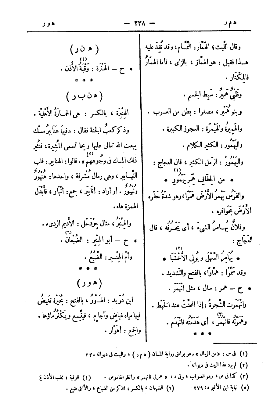 ابن دُرَيد: الهَوْرُ، بالفتح: بُحَيْرة تَغيضُ فيها مياه غياضٍ وآجامٍ، فيتَّسِع ويَكْثُرُ ماؤها. والجمع: أهْوَار.