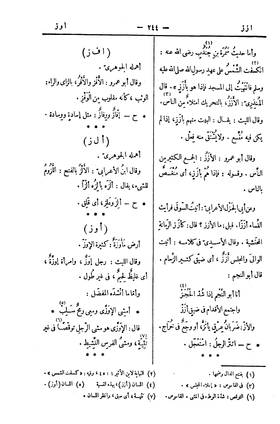 وعن أبي الجَزْل الأعرابيّ: أتيتُ السّوقَ فرأيت النِّساء أزَزًا. قيل: ما الأزز؟ قال: كأزَز الرّمانةِ المحتَشية. وقال الأسدِيّ في كلامه: أتيت الواليَ والمجلس أَزَزٌ، أي ضيّق كثير الزِّحام.