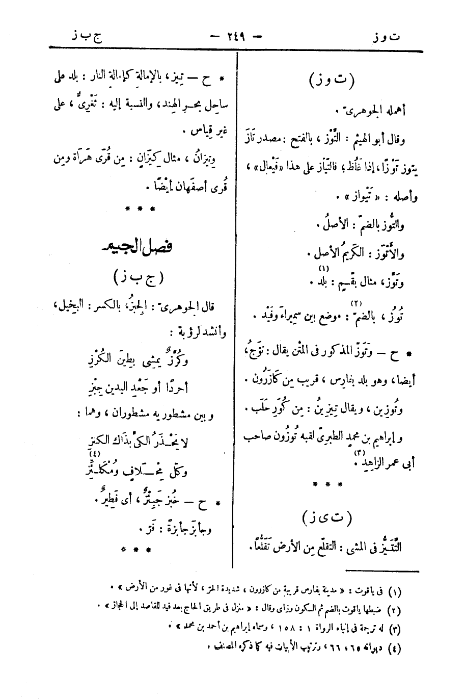 * ح - وتَوَّزُ المذكور في المتْن يقال: توَّجُ أيضا، وهو بلد بفارِس، قريب مِن كَازَرُون.