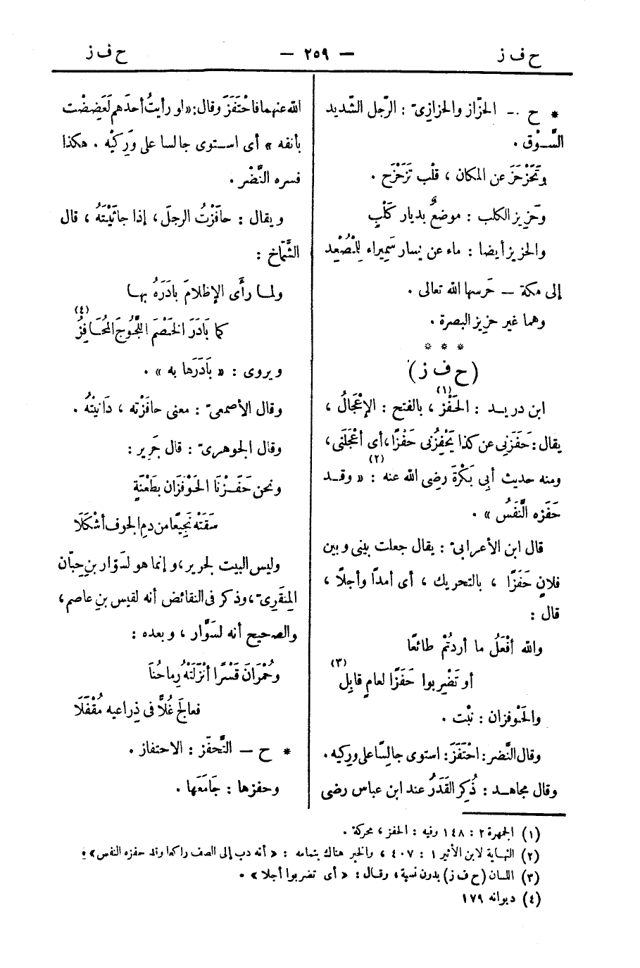 ابن دريد: الحَفْز، بالفتح: الإعْجَالُ، يقال: حَفَزَنِي عن كذا يَحْفِزُني حَفْزًا، أي أعْجَلَني، ومنه حديث أبي بَكْرةَ رضي الله عنه: " وقد حَفَزه النَّفَسُ ".