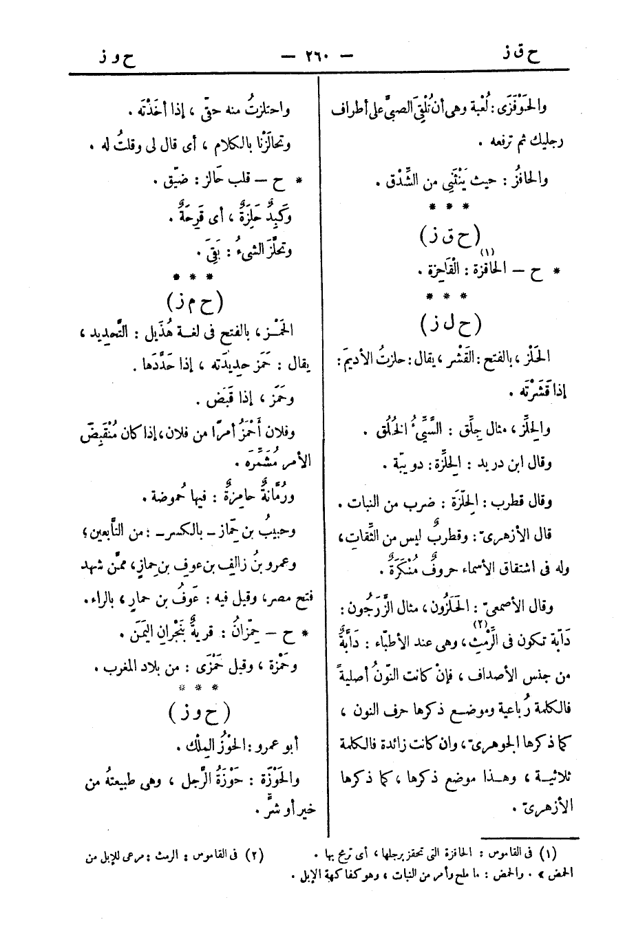 وقال الأصمعيّ: الحَلَزُون، مثال الزَّرَجُون: دَابّة تكون في الرِّمْثِ، وهي عند الأطبّاء: دَابَّةٌ من جنس الأصداف، فإنْ كانت النّونُ أصليةً فالكلمة رُباعية وموضع ذكرها حرف النون، كما ذكرها الجوهريّ، وإن كانت زائدة فالكلمة ثلاثية، وهذا موضع ذكرها، كما ذكرها الأزهريّ.