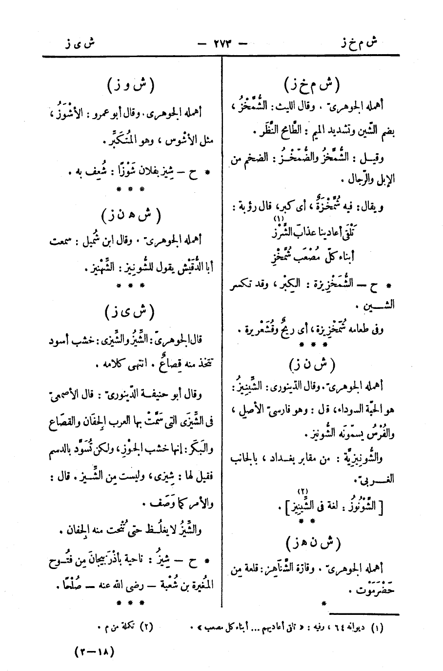 * ح - الشُّمَخْزِيزة: الكِبْر، وقد تكسر الشين.