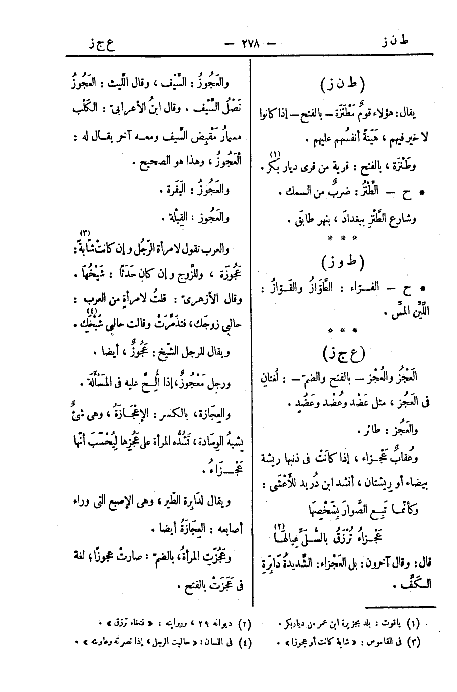 والعَجُوزُ: السَّيْف، وقال اللَّيث: العَجُوزُ نَصْلُ السَّيْف. وقال ابنُ الأعرابيّ: الكَلْب مسمارُ مَقْبِض السَّيف ومعه آخر يقال له: العَجُوزُ، وهذا هو الصحيح.