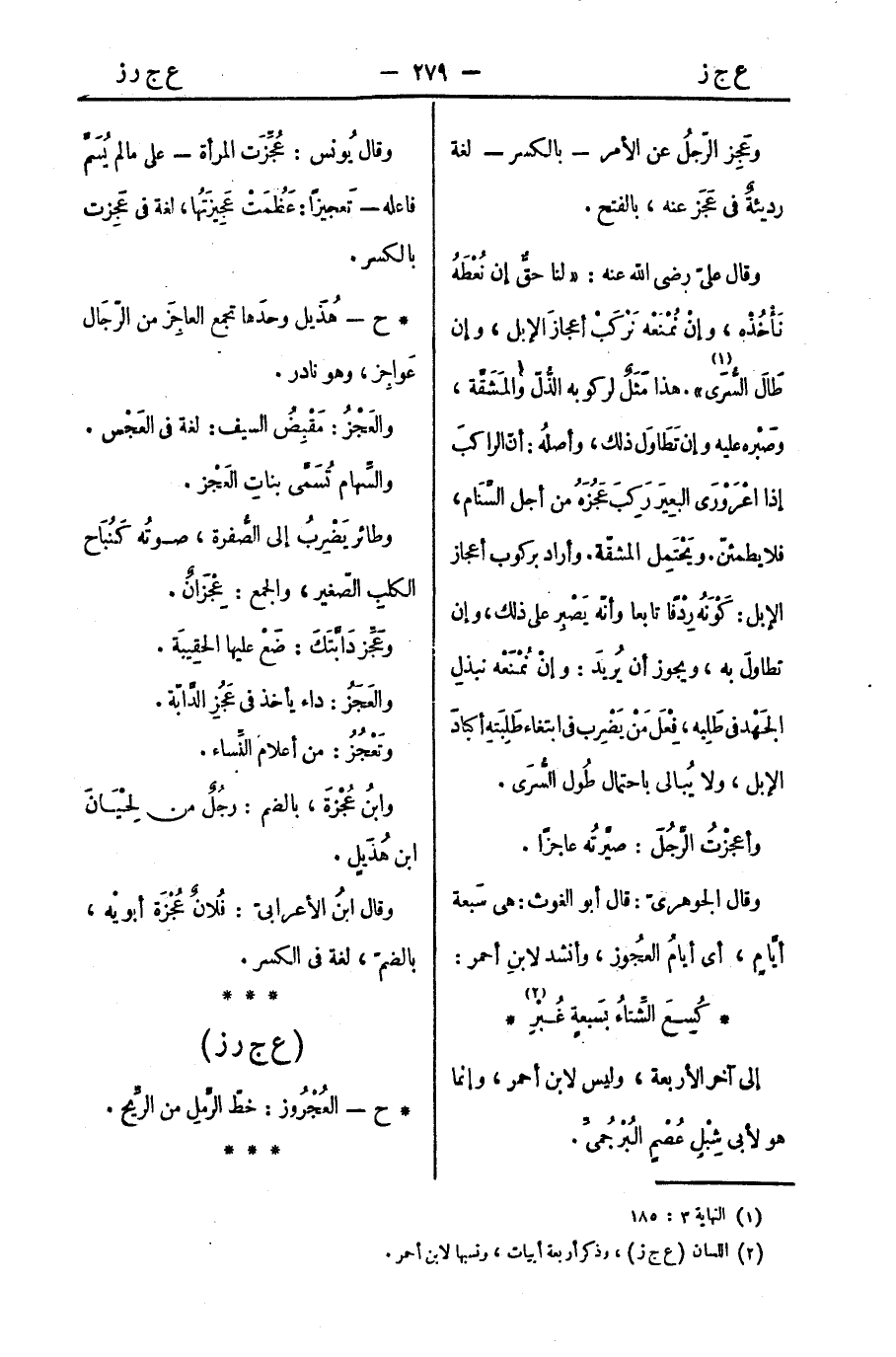 * ح - هُذَيل وحدَها تجمع العاجِزَ من الرّجَال عَواجِز، وهو نادر.