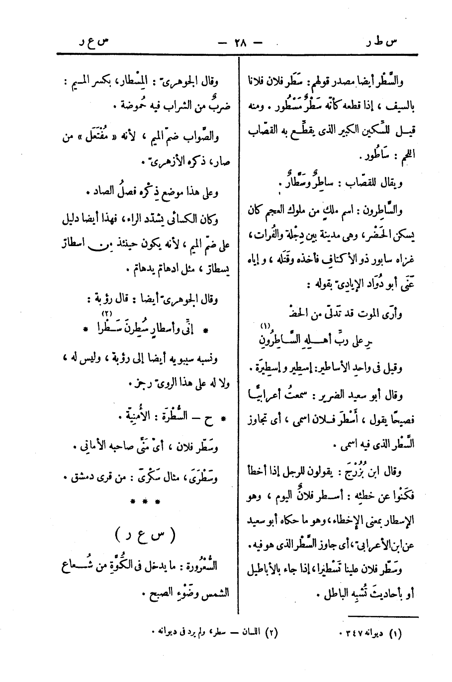 وقال أبو سعيد الضرير: سمعتُ أعرابيًّا فصيحًا يقول، أَسْطَر فلان اسمي، أي تجاوز السَّطْر الذي فيه اسمي.