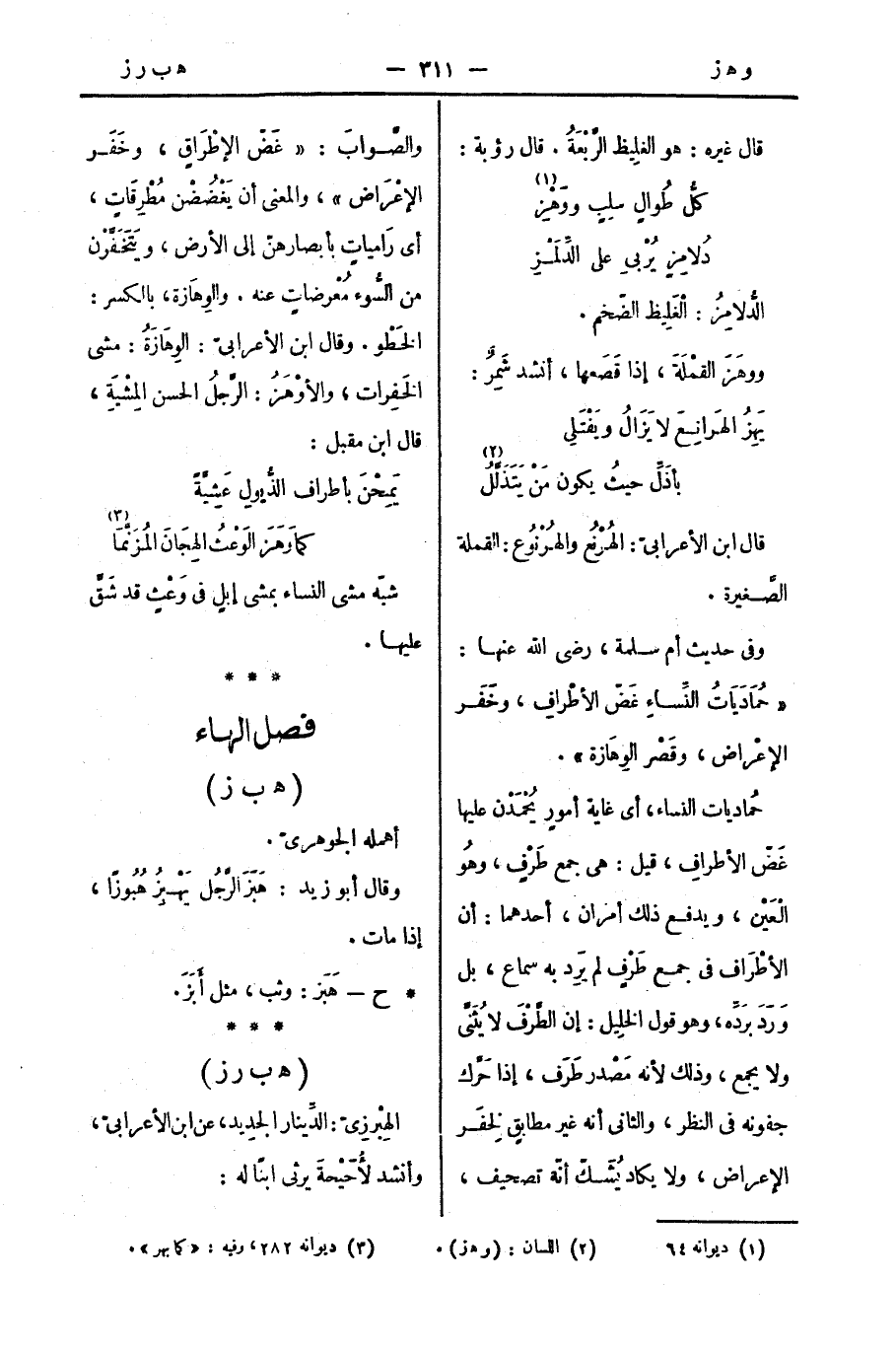 حُماديات النساء، أي غاية أمورٍ يُحْمَدْن عليها غَضّ الأطرافِ، قيل: هي جمع طَرْفٍ، وهُو الْعَيْن، ويدفع ذلك أمرَان، أحدهما: أن الأطْرَاف في جمع طَرْفٍ لم يَرِد به سماع، بل وَرَدَ برَدِّه، وهو قول الخلِيل: إن الطَّرْفَ لا يُثَنَّى ولا يُجمع، وذلك لأنه مَصْدر طَرَف، إذا حَرَّك جفونه في النظر، والثاني أنه غير مطابقٍ لِخَفَر الإعراض، ولا يكاد يُشَكّ أنّه تصحيف. والصَّوابُ: " غَضّ الإطْرَاقِ، وخَفَر الإعْرَاض "، والمعنى أن يَغْضُضْن مُطْرِقَاتٍ، أي رَامياتٍ بأبصارهنّ إلى الأرض، ويَتَخَفَّرْن من السُّوء مُعْرضاتٍ عنه. والوِهَازة، بالكسر: الخَطْو. وقال ابن الأعرابيّ: الوِهَازَةُ: مشي الخَفِرات، والأوْهَزُ: الرَّجلُ الحسن المِشْيَةِ، قال ابن مقبل:
