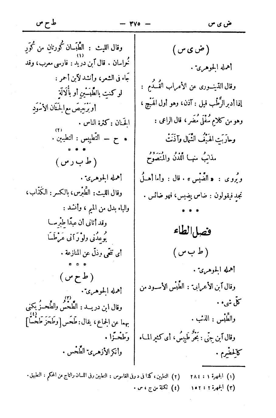 وقال الليث: الطَّبَسان كُورتانِ من كُوَرِ خُراسان. قال ابن دريد: فارسي معرب، وقد جاء في الشعر، وأنشد لابن أحمر: