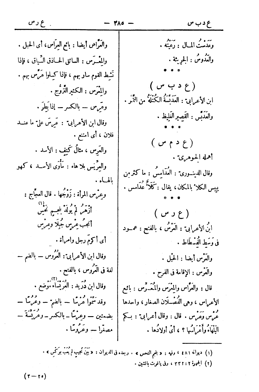 ابنُ الأعرابيّ: العَرْسُ، بالفتح: عمود في وَسَطِ الفُسْطَاط.