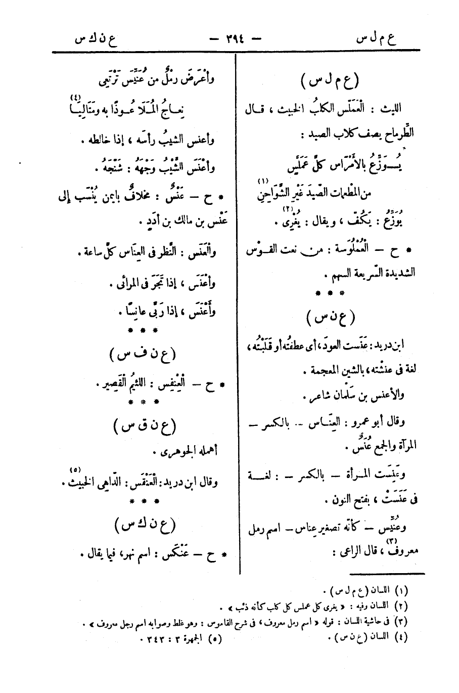 ابن دريد: عَنَست العودَ، أي عطفتُه أو قَلَبْتُه، لغة في عنشْته، بالشين المعجمة.
