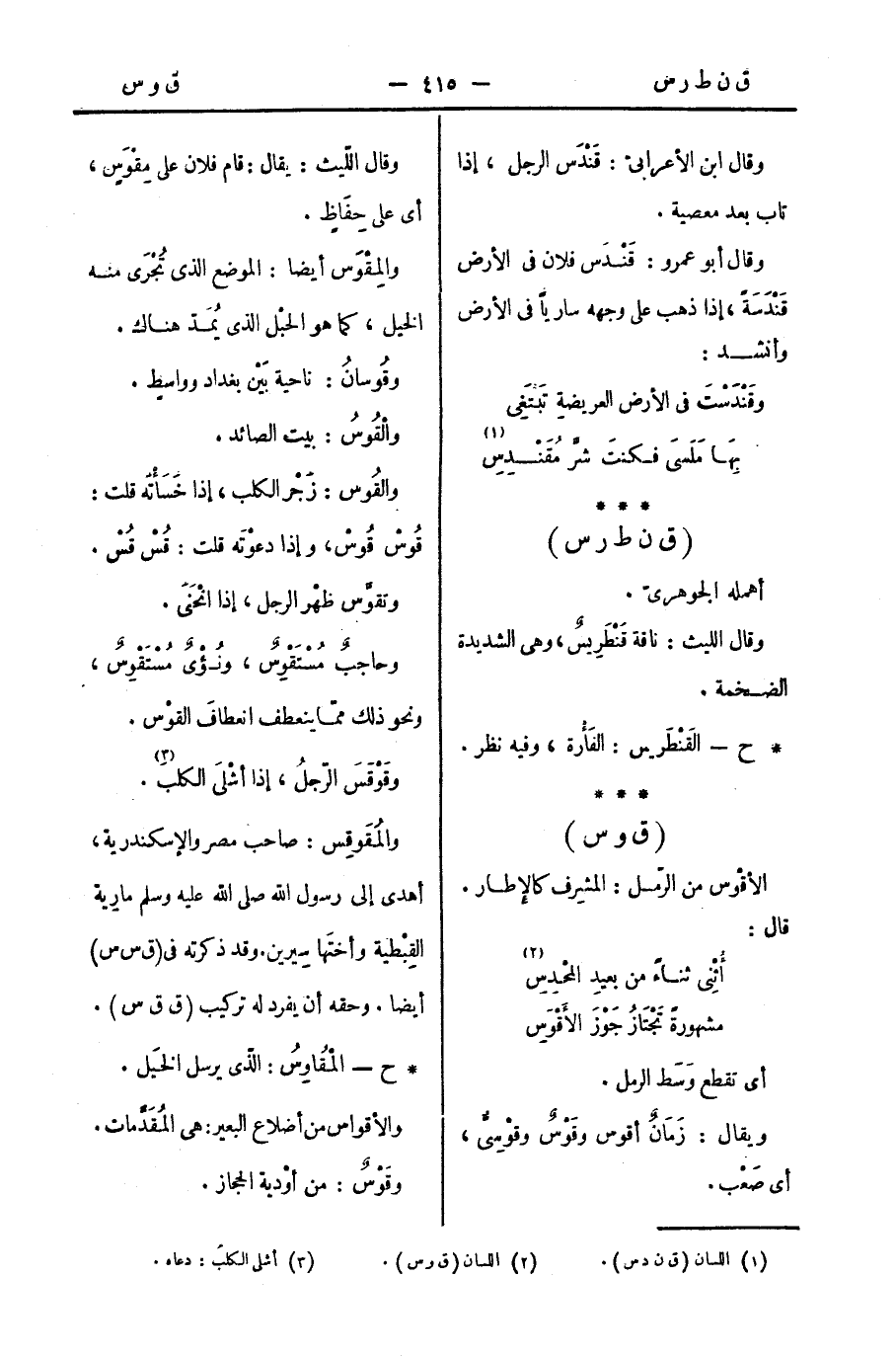 والقُوس: زَجْر الكلب، إذا خَسَأْتَه قلت: قُوسْ قُوسْ، وإذا دعوْتَه قلت: قُسْ قُسْ.
