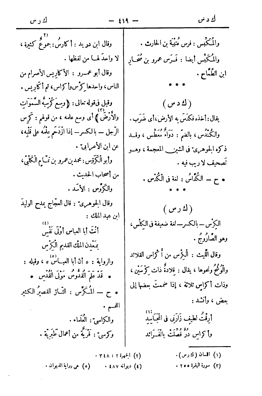 وقيل في قوله تعالى: (وسِعَ كُرْسِيُّه السَّمَوَاتِ والأَرْضَ) أي وسع علمه، من قولهم: كَرِس الرّجل - بالكسر - إذا ازْدَحَم عِلْمُه على قَلْبِه، عن ابن الأعرابيّ.