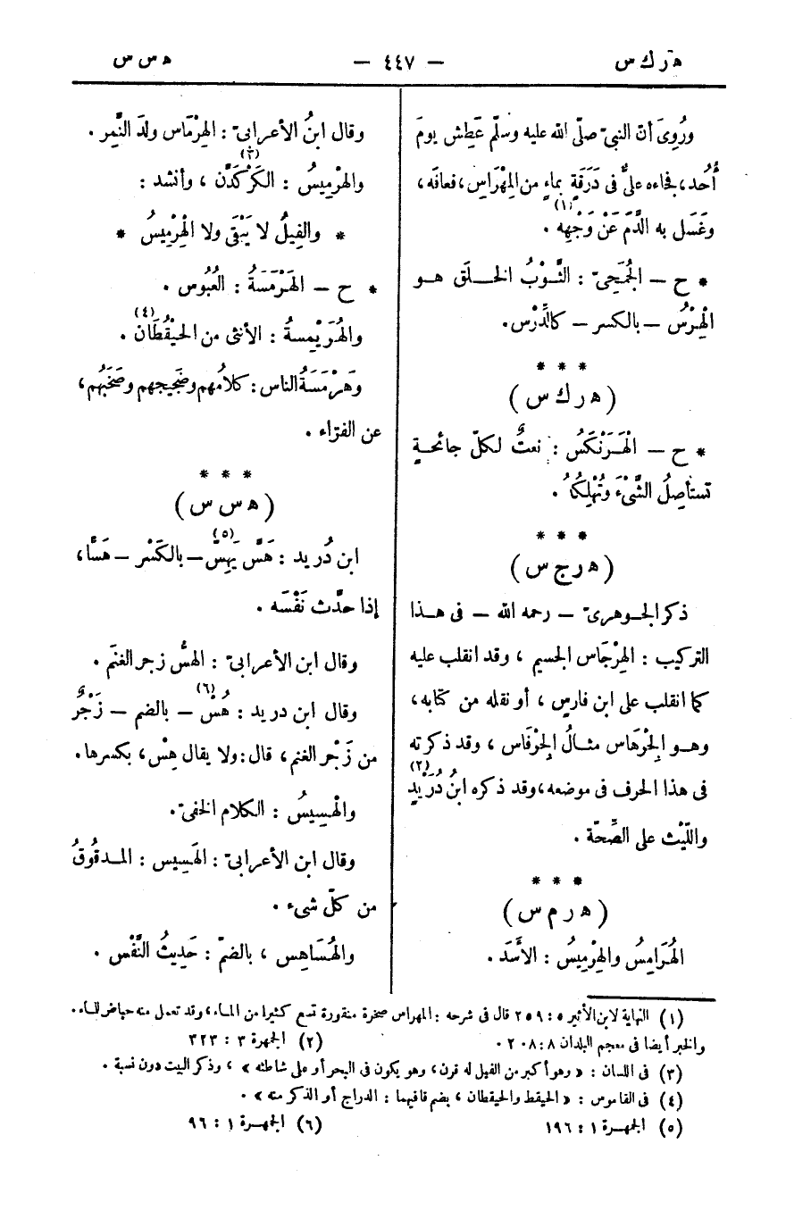 ذكر الجوهريّ - رحمه الله - في هذا التركيب: الهِرْجَاس الجسيم، وقد انقلب عليه كما انقلب على ابن فارسٍ، أو نقله من كتابه، وهو الجِرْهَاس مثالُ الجِرْفَاس، وقد ذكرته في هذا الحرف في موضعه، وقد ذكره ابنُ دُرَيْدٍ واللّيْث على الصِّحّة.