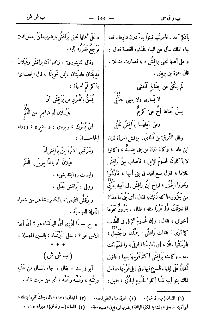 وقال الدينوريّ: زعموا أن براقشَ وهَيْلانَ مَدِينَتان عاديَّتان باليمن خَرِبتَا، قال الجعديّ يذكر فَمَ امرأة: