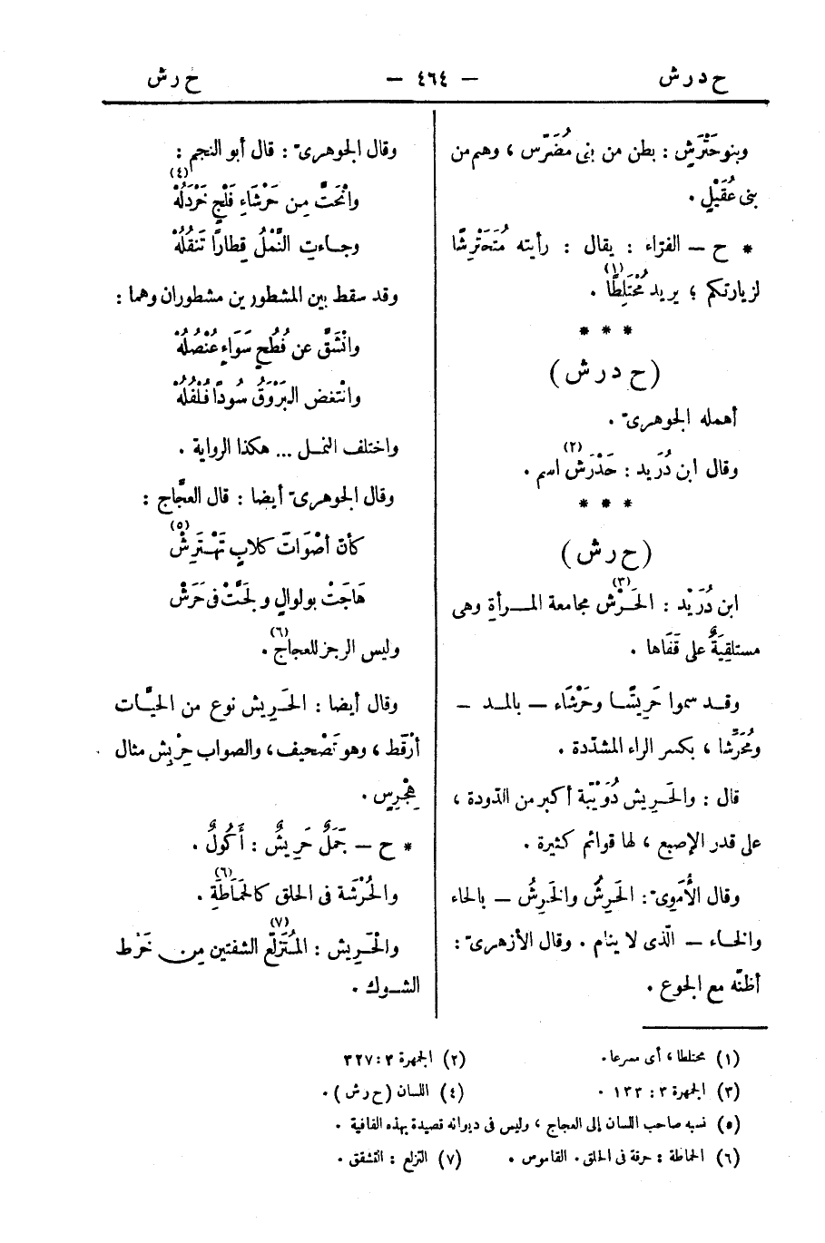 وقال أيضا: الحَرِيش نوع من الحيَّات أرْقَط، وهو تَصْحيف، والصواب حِرْبِش مثال هِجْرِسٍ.