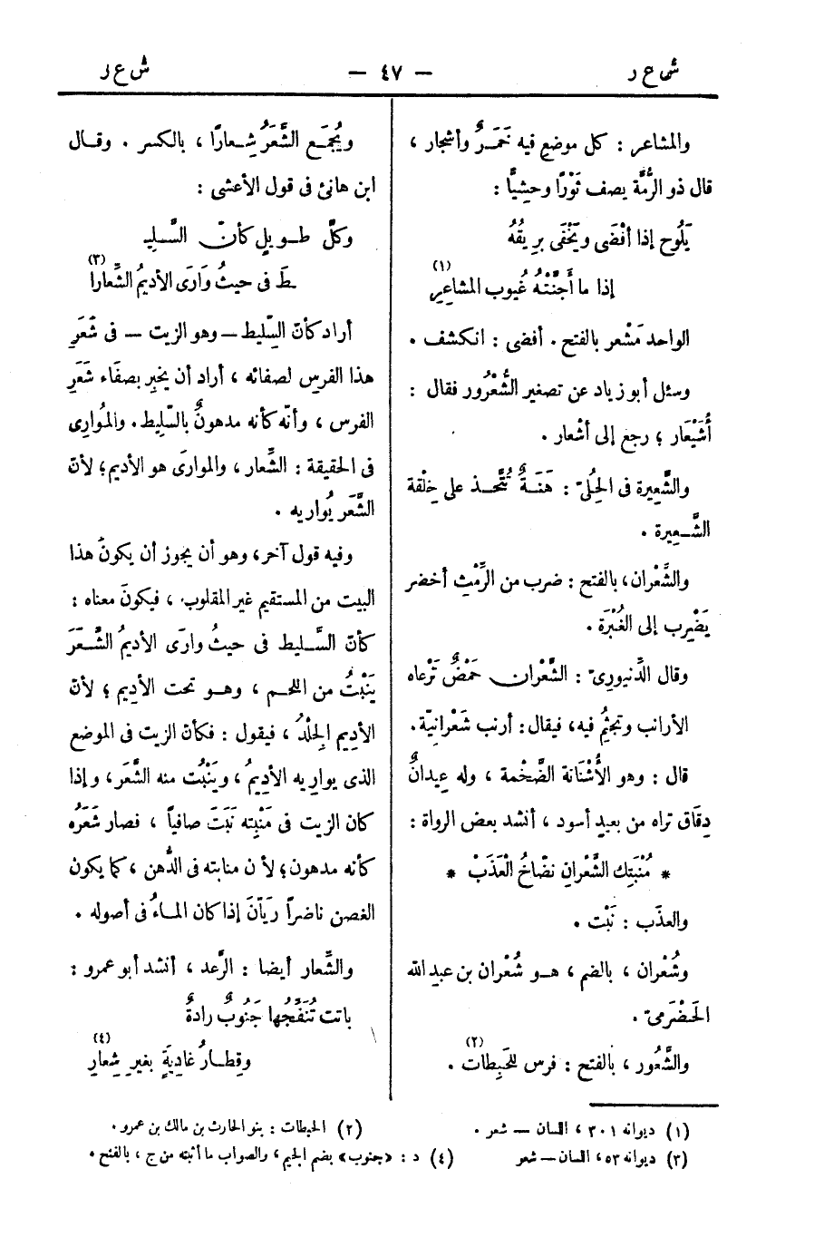 ويُجمَع الشَّعَرُ شِعارًا، بالكسر. وقال ابن هانئ في قول الأعشى: