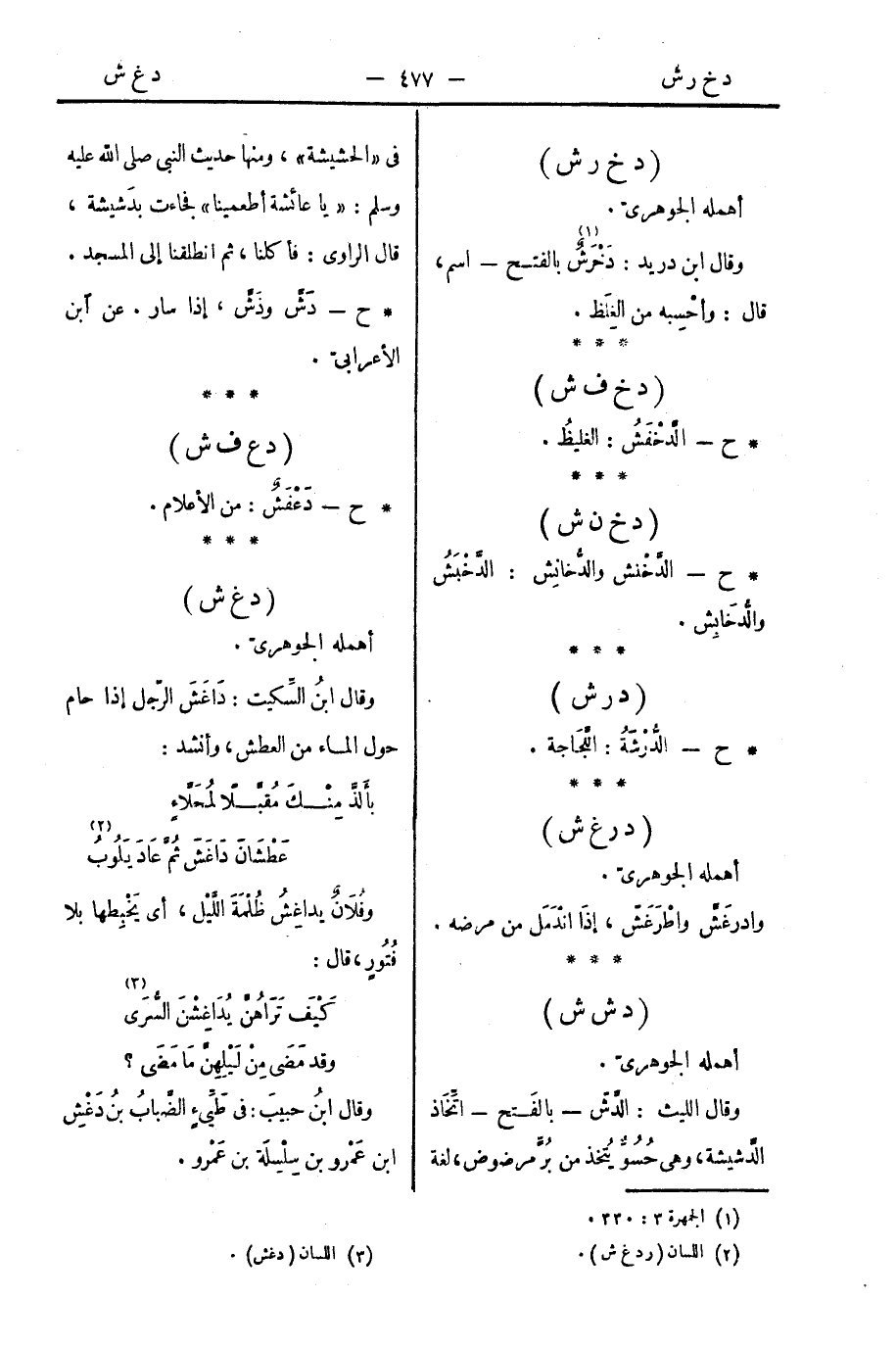 وقال الليث: الدَّشّ - بالفَتح - اتِّخَاذ الدَّشيشة، وهي حُسُوُّ يُتخذ من بُرٍّ مرضوض، لغة في " الحشيشة "، ومنها حديث النبي صلى الله عليه وسلم: " يا عائشة أطعمينا " فجاءت بدَشيشة، قال الراوي: فأكلنا، ثم انطلقنا إلى المسجد.