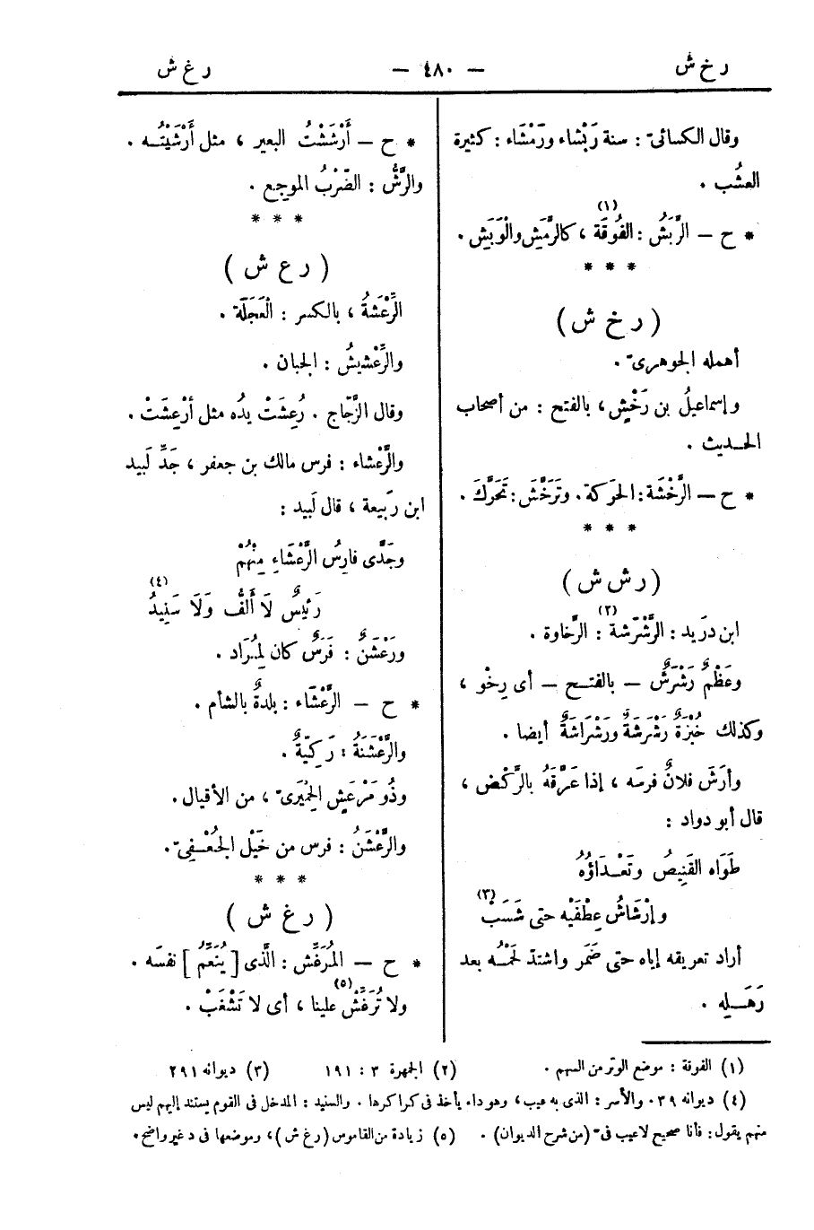 * ح - أَرْشَشْتُ البعير، مثل أَرْشَيْتُه. والرَّشُّ: الضّرْبُ الموجِع.