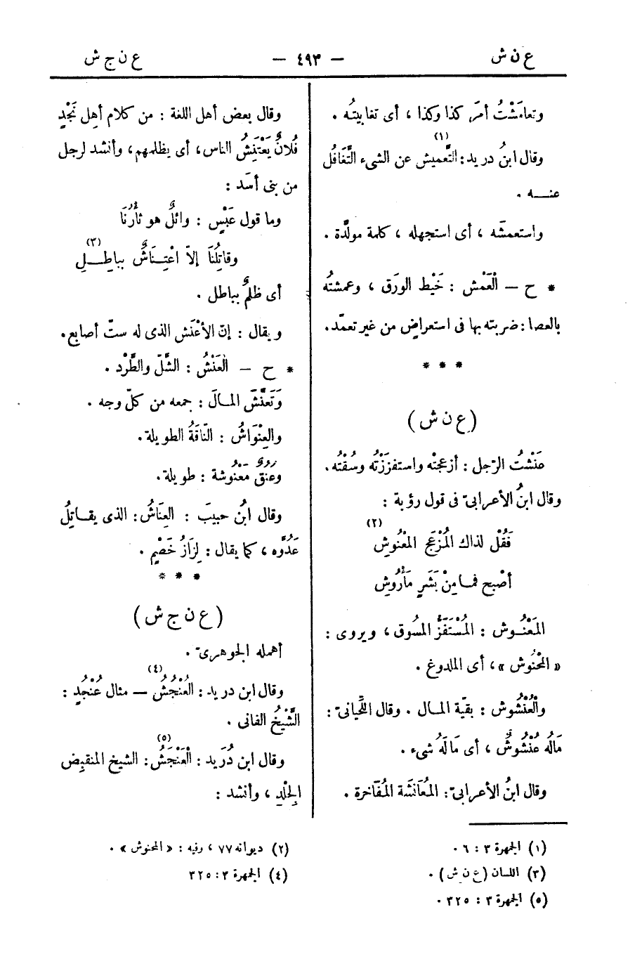 وقال ابن دريد: العُنْجُشُ - مثال عُنْجُدٍ: الشَّيْخُ الفاني.
