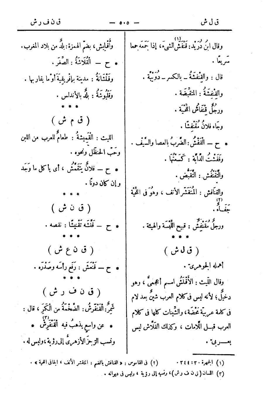 وقال اللّيث: الأَقْلَشُ اسم أعجميٌّ، وهو دخيلٌ؛ لأنه ليس في كلام العرب شينٌ بعد لام في كلمة عربيّة مَحْضَة، والشِّينات كلها في كلام العرب قبل اللَّامات، وكذلك القَلَّاش ليس بعربيّ.