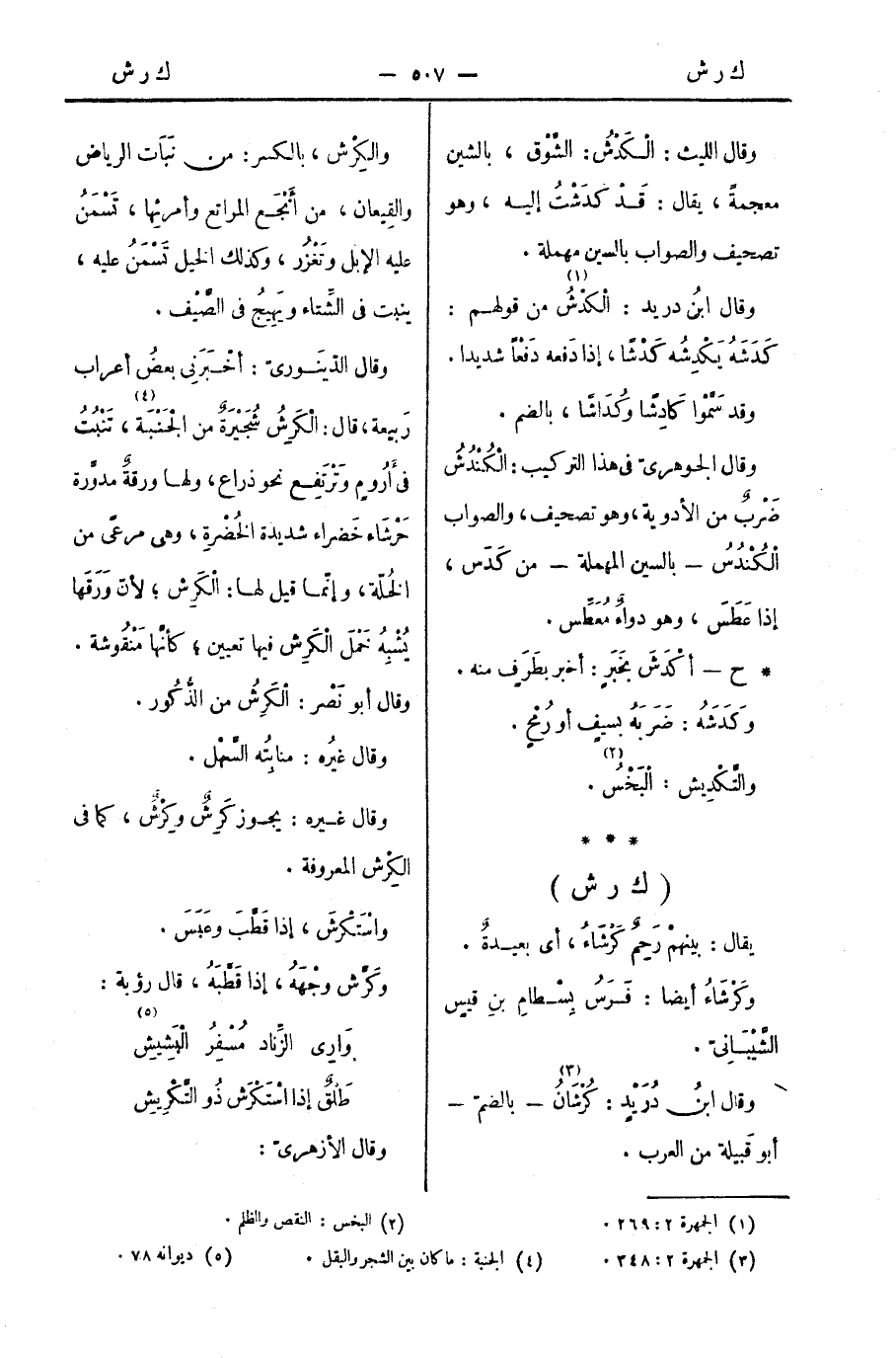 والكِرْش، بالكسر: من نَبَات الرياض والقِيعان، من أَنْجَع المراتع وأمرئِها، تَسْمَنُ عليه الإبل وتَغْزُر، وكذلك الخيل تَسْمَنُ عليه، ينبت في الشِّتاء ويَهِيجُ في الصَّيْف.