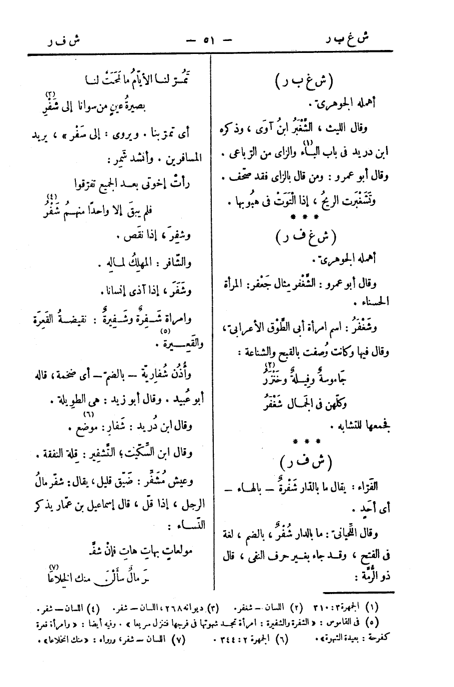 وقال اللِّحيانيّ: ما بالدار شُفْرٌ، بالضم، لغة في الفتح، وقد جاء بغير حرف النفي، قال ذو الرُّمَّة: