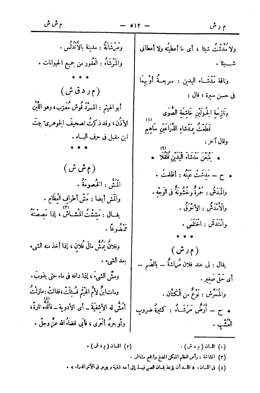 أبو الهيثم: المرْدَقُوش مُعَرّب، وهو اللَّيِّن الأذُن، وقد ذكرتُ تصحيفَ الجوهريّ بيتَ ابن مقبل في حرف الباء.