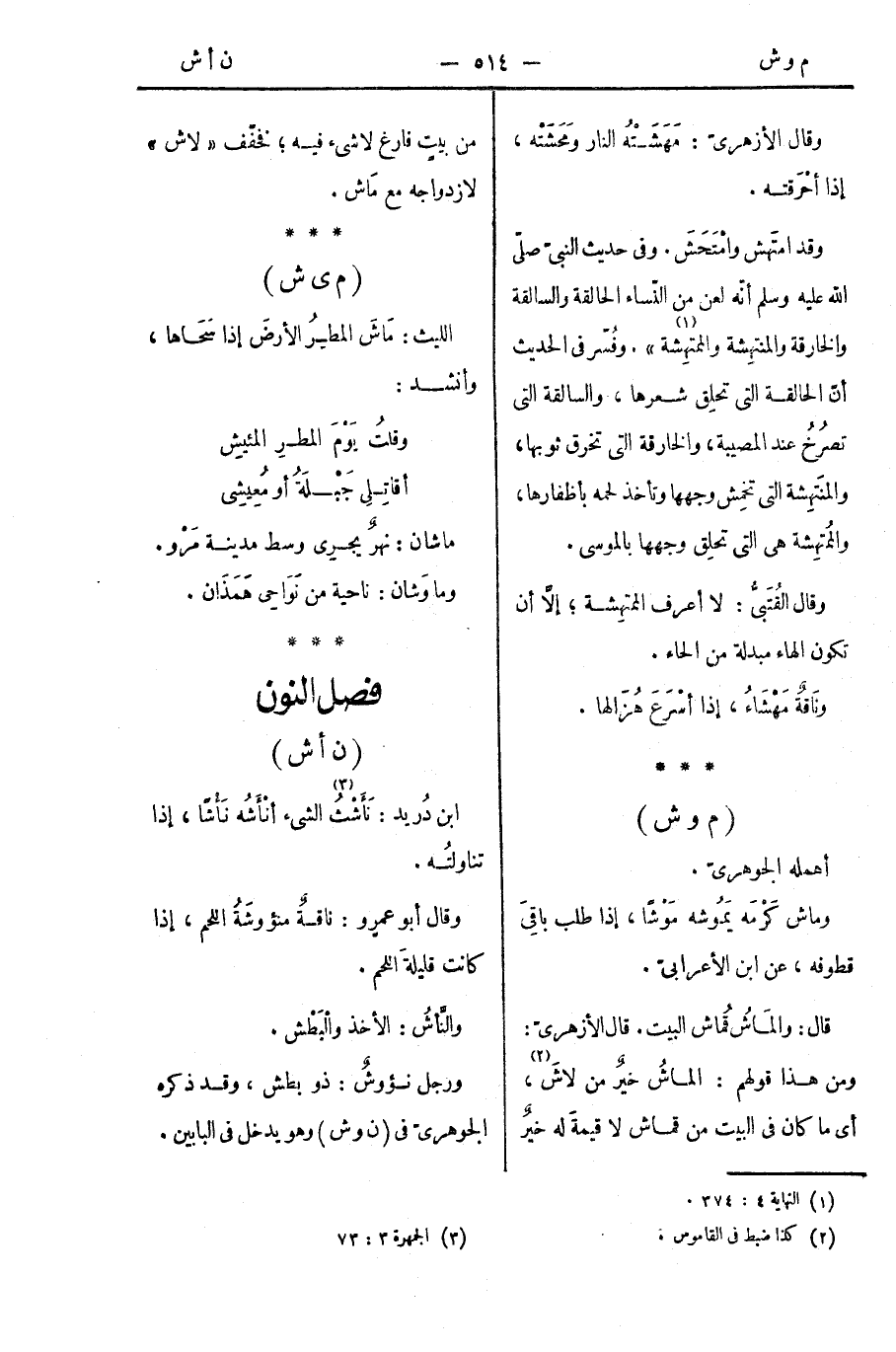 قال: والمَاشُ قُماش البيت. قال الأزهريّ: ومن هذا قولهم: الماشُ خيرٌ من لاشَ، أي ما كان في البيت من قماش لا قيمةَ له خيرٌ من بيتٍ فارغ لا شيء فيه؛ فخفّف " لاش " لازدواجه مع مَاش.