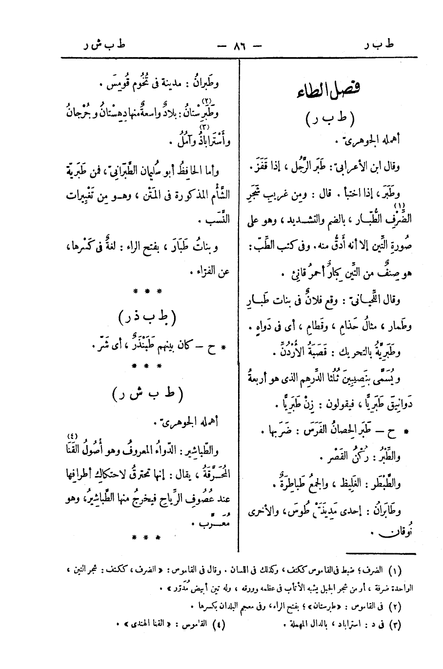 وطَبَرَ، إذا اختبأ. قال: ومِن غريبِ شَجَرِ الضِّرْفِ الطُّبّار، بالضم والتشديد، وهو على صُورةِ التِّين إلا أنه أَدقُّ منه. وفي كتب الطِّبّ: هو صِنفٌ من التِّين كِبارٌ أحمرُ قانِئ.