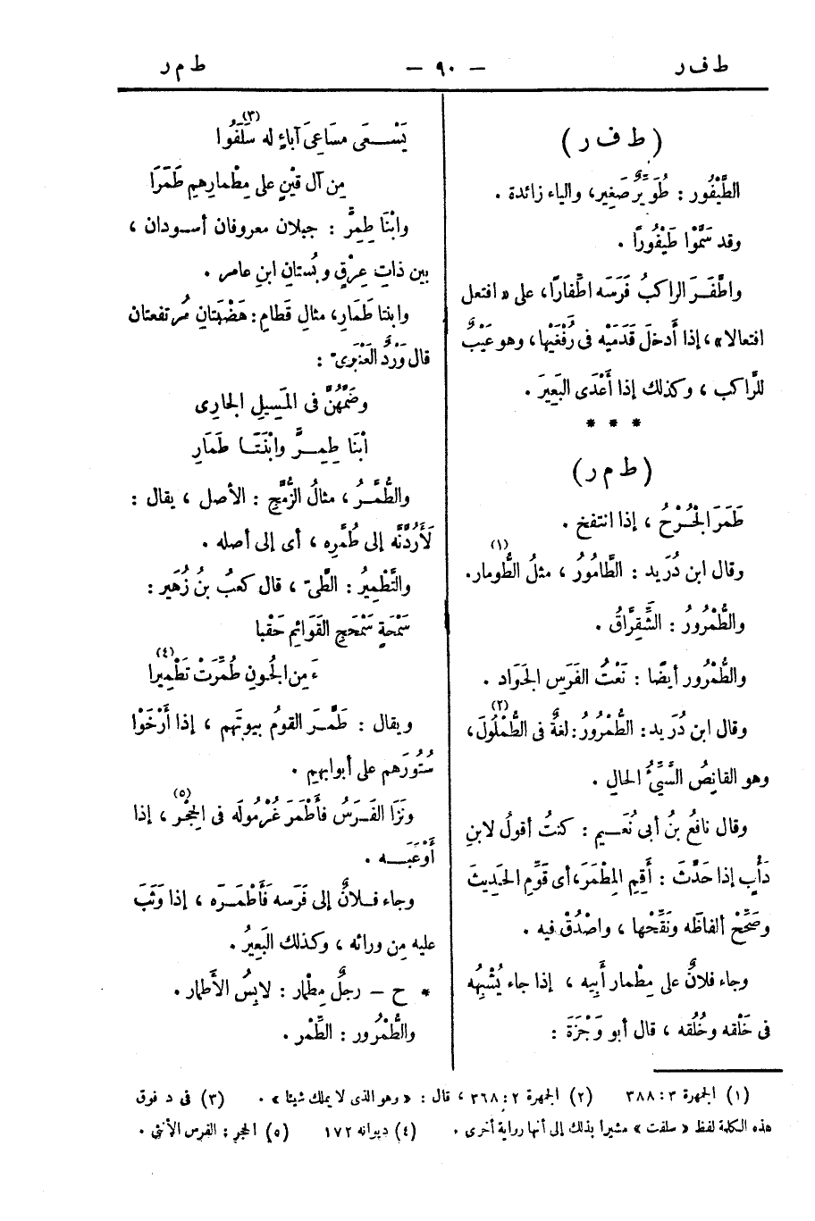 والطُّمَّرُ، مثالُ الزُّمَّجِ: الأصل، يقال: لَأَرُدَّنَّه إلى طُمَّرِه، أي إلى أصله.