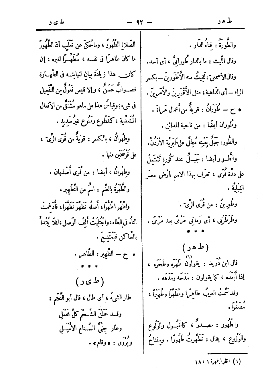 والطَّهُور: مصدرٌ، كالقَبُول والوَلُوع والوَزُوع، يقال: تَطَهَّرتُ طَهُورًا. ومِفتاحُ الصّلاةِ الطَّهُورُ، وما حُكيَ عن ثَعْلَبٍ أنّ الطَّهُورَ ما كان طاهرًا في نفسه، مُطَهِّرًا لغيره، إن كان هذا زيادةَ بيانٍ لنهايته في الطَّهارة فصوابٌ حَسَنٌ، وإلا فليس فَعُولٌ مِن التَّفْعِيل في شيء؛ وقِياسُ هذا على ما هو مُشْتَقٌّ من الأفعال المُتَعدِّية، كقَطُوع ومَنُوع غيرُ سَدِيدٍ.