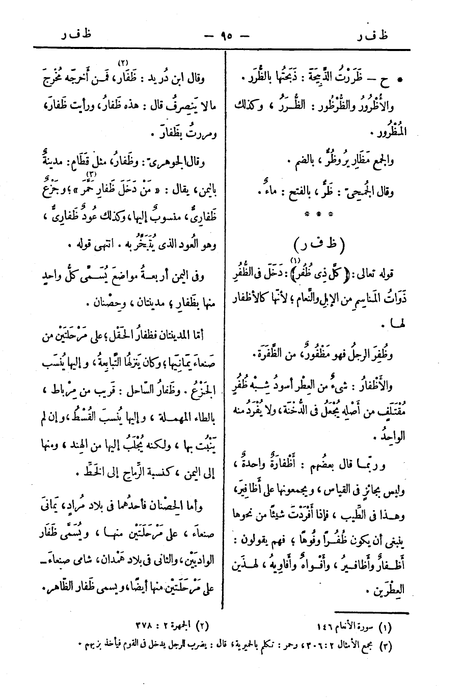 وقال الجوهريّ: وظَفارُ، مثل قَطَامِ: مدينةٌ باليمن، يقال: " مَنْ دَخَلَ ظَفارِ حَمَّرَ "؛ وجَزْعٌ ظَفارِيٌّ، منسوبٌ إليها، وكذلك عُودٌ ظَفارِيٌّ، وهو العُود الذي يُتَبَخَّرُ به. انتهى قوله.