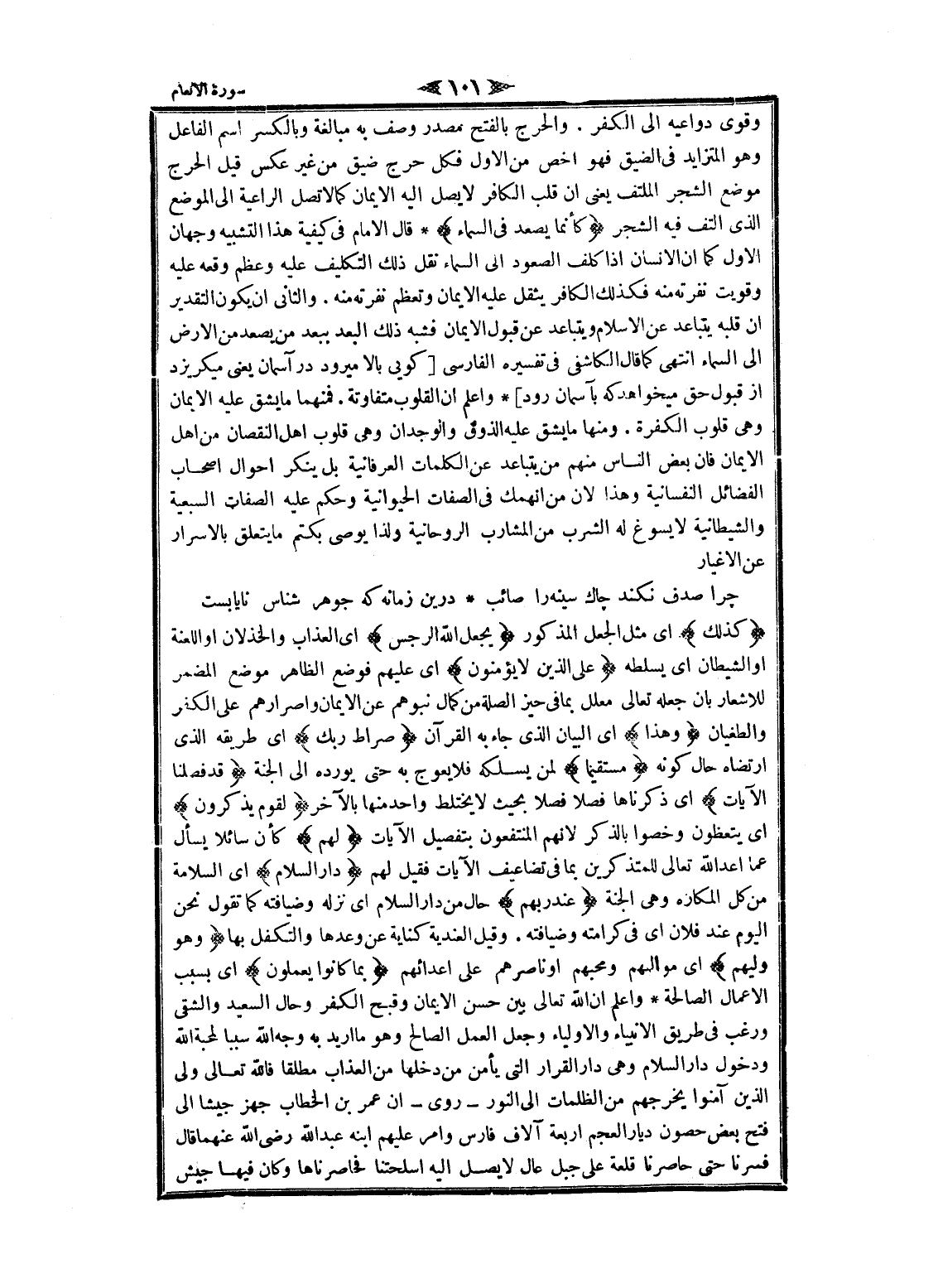 كَذلِكَ اى مثل الجعل المذكور يَجْعَلُ اللَّهُ الرِّجْسَ اى العذاب والخذلان او اللعنة او الشيطان اى يسلطه عَلَى الَّذِينَ لا يُؤْمِنُونَ اى عليهم فوضع الظاهر موضع المضمر للاشعار بان جعله تعالى معلل بما فى حيز الصلة من كمال نبوهم عن الايمان وإصرارهم على الكفر والطغيان وَهذا اى البيان الذي جاء به القرآن صِراطُ رَبِّكَ اى طريقه الذي ارتضاه حال كونه مُسْتَقِيماً لمن يسلكه فلا يعوج به حتى يورده الى الجنة قَدْ فَصَّلْنَا الْآياتِ اى ذكرناها فصلا فصلا بحيث لا يختلط واحد منها بالآخر لِقَوْمٍ يَذَّكَّرُونَ اى يتعظون وخصوا بالذكر لانهم المنتفعون بتفصيل الآيات لَهُمْ كأن سائلا يسأل عما أعد الله تعالى للمتذكرين بما فى تضاعيف الآيات فقيل لهم دارُ السَّلامِ اى السلامة من كل المكاره وهى الجنة عِنْدَ رَبِّهِمْ حال من دار السلام اى نزله وضيافته كما تقول نحن اليوم عند فلان اى فى كرامته وضيافته. وقيل العندية كناية عن وعدها والتكفل بها وَهُوَ وَلِيُّهُمْ اى مولهم ومحبهم او ناصرهم على أعدائهم بِما كانُوا يَعْمَلُونَ اى بسبب الأعمال الصالحة واعلم ان الله تعالى بين حسن الايمان وقبح الكفر وحال السعيد والشقي ورغب فى طريق الأنبياء والأولياء وجعل العمل الصالح وهو ما أريد به وجه الله سببا لمحبة الله ودخول دار السلام وهى دار القرار التي يأمن من دخلها من العذاب مطلقا فالله تعالى ولى الذين آمنوا يخرجهم من الظلمات الى النور- روى- ان عمر بن الخطاب جهز جيشا الى فتح بعض حصون ديار العجم اربعة آلاف فارس وامر عليهم ابنه عبد الله رضى الله عنهما قال فسرنا حتى حاصرنا قلعة على جبل عال لا يصل اليه أسلحتنا فحاصرناها وكان فيها جيش