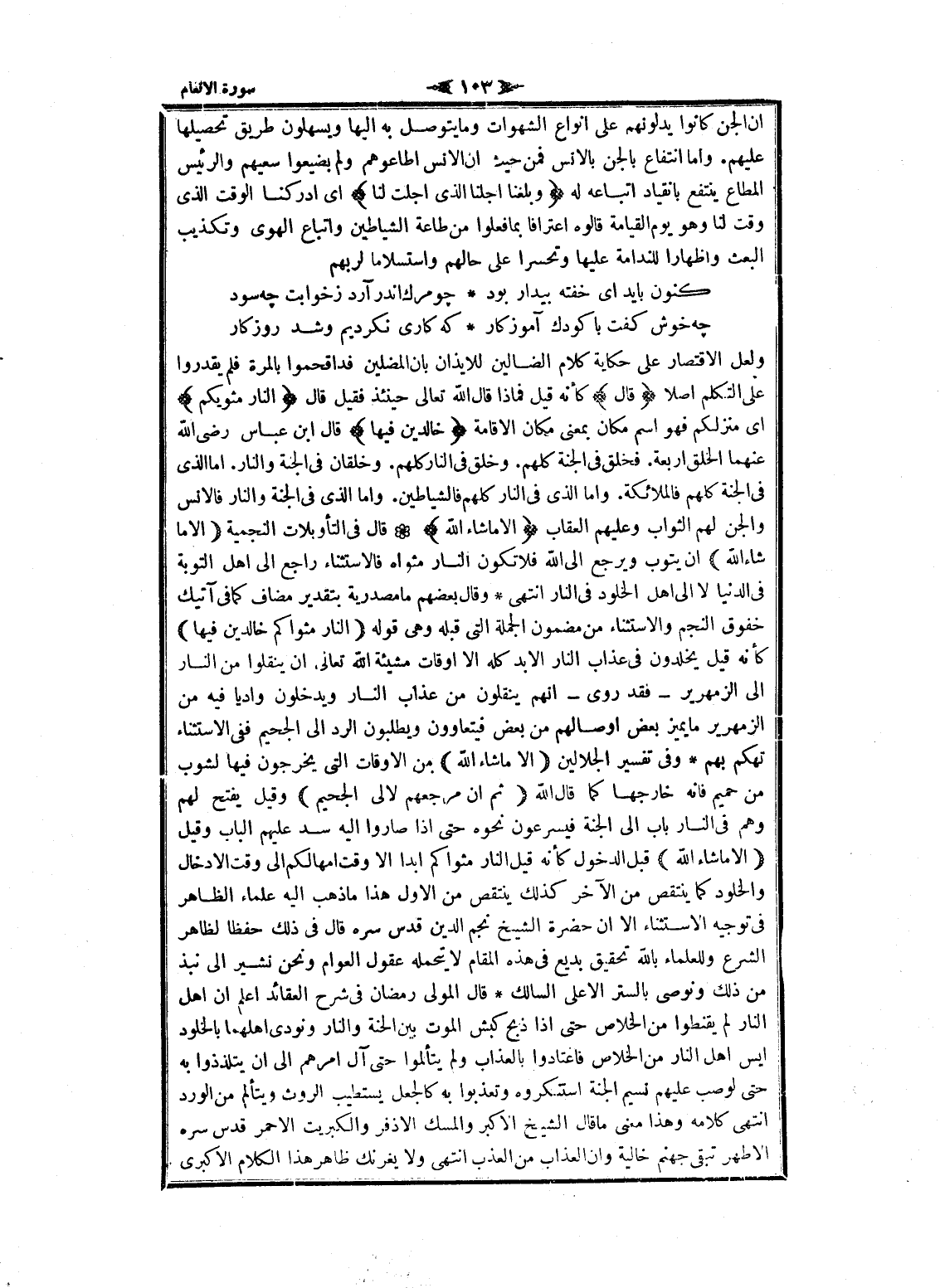 ولعل الاقتصار على حكاية كلام الضالين للايذان بان المضلين قد اقحموا بالمرة فلم يقدروا على التكلم أصلا قالَ كأنه قيل فماذا قال الله تعالى حينئذ فقيل قال النَّارُ مَثْواكُمْ اى منزلكم فهو اسم مكان بمعنى مكان الاقامة خالِدِينَ فِيها قال ابن عباس رضى الله عنهما الخلق اربعة. فخلق فى الجنة كلهم. وخلق فى النار كلهم. وخلقان فى الجنة والنار. اما الذي فى الجنة كلهم فالملائكة. واما الذي فى النار كلهم فالشياطين. واما الذي فى الجنة والنار فالانس والجن لهم الثواب وعليهم العقاب إِلَّا ما شاءَ اللَّهُ قال فى التأويلات النجمية إِلَّا ما شاءَ اللَّهُ ان يتوب ويرجع الى الله فلا تكون النار مثواه فالاستثناء راجع الى اهل التوبة فى الدنيا لا الى اهل الخلود فى النار انتهى وقال بعضهم ما مصدرية بتقدير مضاف كما فى آتيك خفوق النجم والاستثناء من مضمون الجملة التي قبله وهى قوله النَّارُ مَثْواكُمْ خالِدِينَ فِيها كأنه قيل يخلدون فى عذاب النار الابد كله الا اوقات مشيئة الله تعالى ان ينقلوا من النار الى الزمهرير- فقد روى- انهم ينقلون من عذاب النار ويدخلون واديا فيه من الزمهرير ما يميز بعض أوصالهم من بعض فيتعاوون ويطلبون الرد الى الجحيم ففى الاستثناء تهكم بهم وفى تفسير الجلالين إِلَّا ما شاءَ اللَّهُ من الأوقات التي يخرجون فيها لشوب من حميم فانه خارجها كما قال الله ثُمَّ إِنَّ مَرْجِعَهُمْ لَإِلَى الْجَحِيمِ وقيل يفتح لهم وهم فى النار باب الى الجنة فيسرعون نحوه حتى إذا صاروا اليه سد عليهم الباب وقيل إِلَّا ما شاءَ اللَّهُ قبل الدخول كأنه قيل النار مثواكم ابدا الا وقت امهالكم الى وقت الإدخال والخلود كما ينتقص من الآخر كذلك ينتقص من الاول هذا ما ذهب اليه علماء الظاهر فى توجيه الاستثناء الا ان حضرة الشيخ نجم الدين قدس سره قال فى ذلك حفظا لظاهر الشرع وللعلماء بالله تحقيق بديع فى هذه المقام لا يتحمله عقول العوام ونحن نشير الى نبذ من ذلك ونوصى بالستر الا على السالك قال المولى رمضان فى شرح العقائد اعلم ان اهل النار لم يقنطوا من الخلاص حتى إذا ذبح كبش الموت بين الجنة والنار ونودى أهلهما بالخلود ايس اهل النار من الخلاص فاعتادوا بالعذاب ولم يتألموا حتى آل أمرهم الى ان يتلذذوا به حتى لوصب عليهم نسيم الجنة استنكروه وتعذبوا به كالجعل يستطيب الروث ويتألم من الورد انتهى كلامه وهذا معنى ما قال الشيخ الأكبر والمسك الأذفر والكبريت الأحمر قدس سره الأطهر تبقى جهنم خالية وان العذاب من العذاب انتهى ولا يغرنك ظاهر هذا الكلام الاكبرى